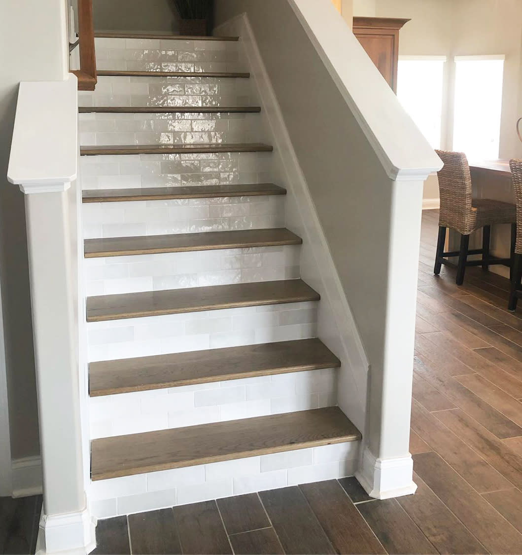 Add some durability and style to your staircase by tiling it or adding it to the rise for a decorative element. Below, our homeowner chose our wood-look porcelain from our Titus Collection in the Camel color. Its 8"x48" plank size fits perfectly as a tread.