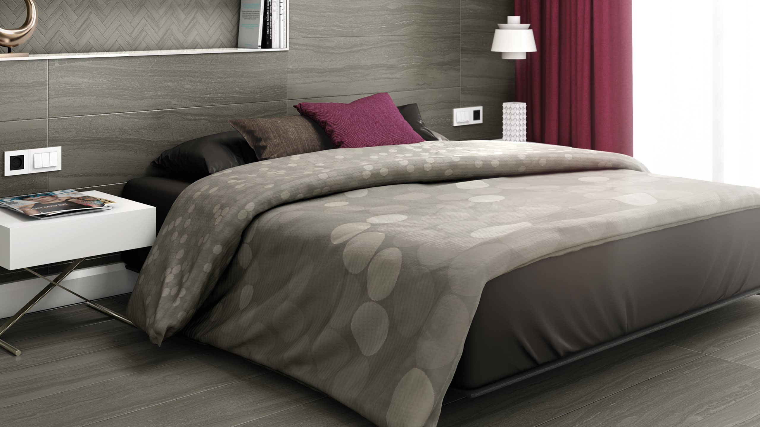 Another way to add interest to your bedroom is to tile the wall in the same material as the floor, and maybe create a niche tiled in a coordinating accent.