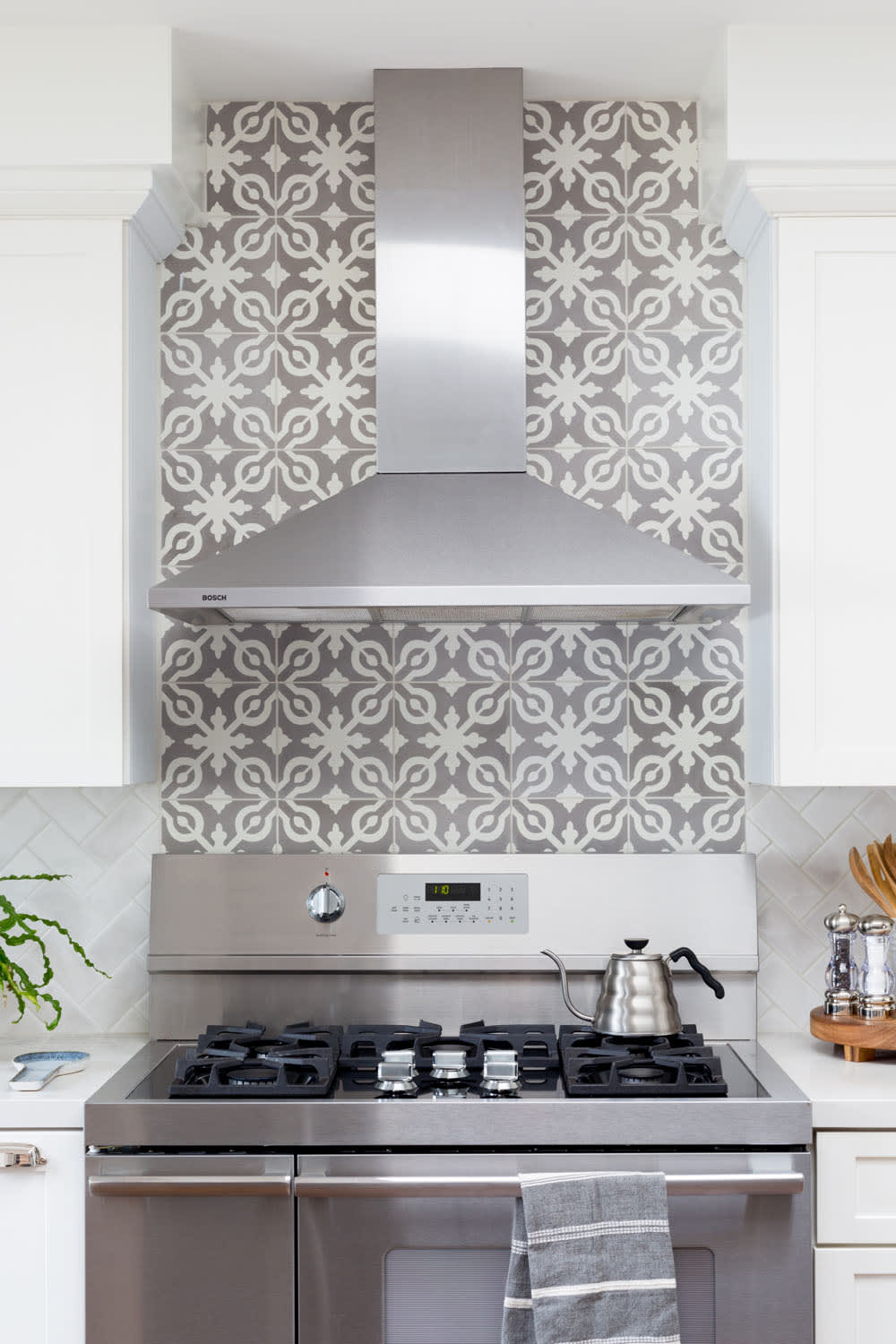 A good way to bring in a decorative tile is above the stove. Designer Marissa Cramer chose our Remy 8x8 cement tile in Soffia