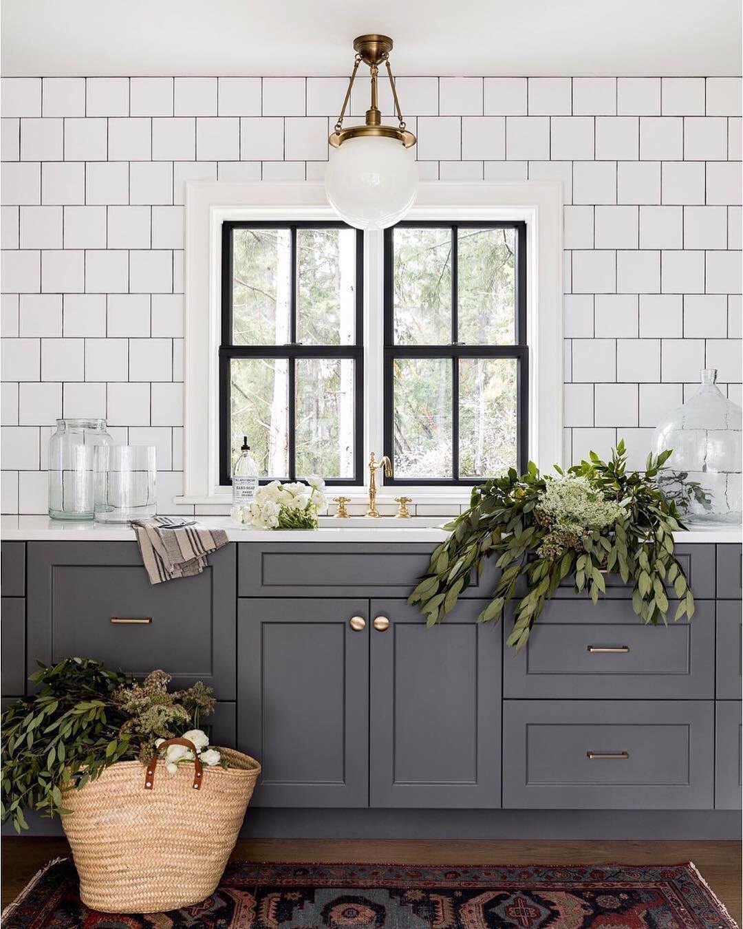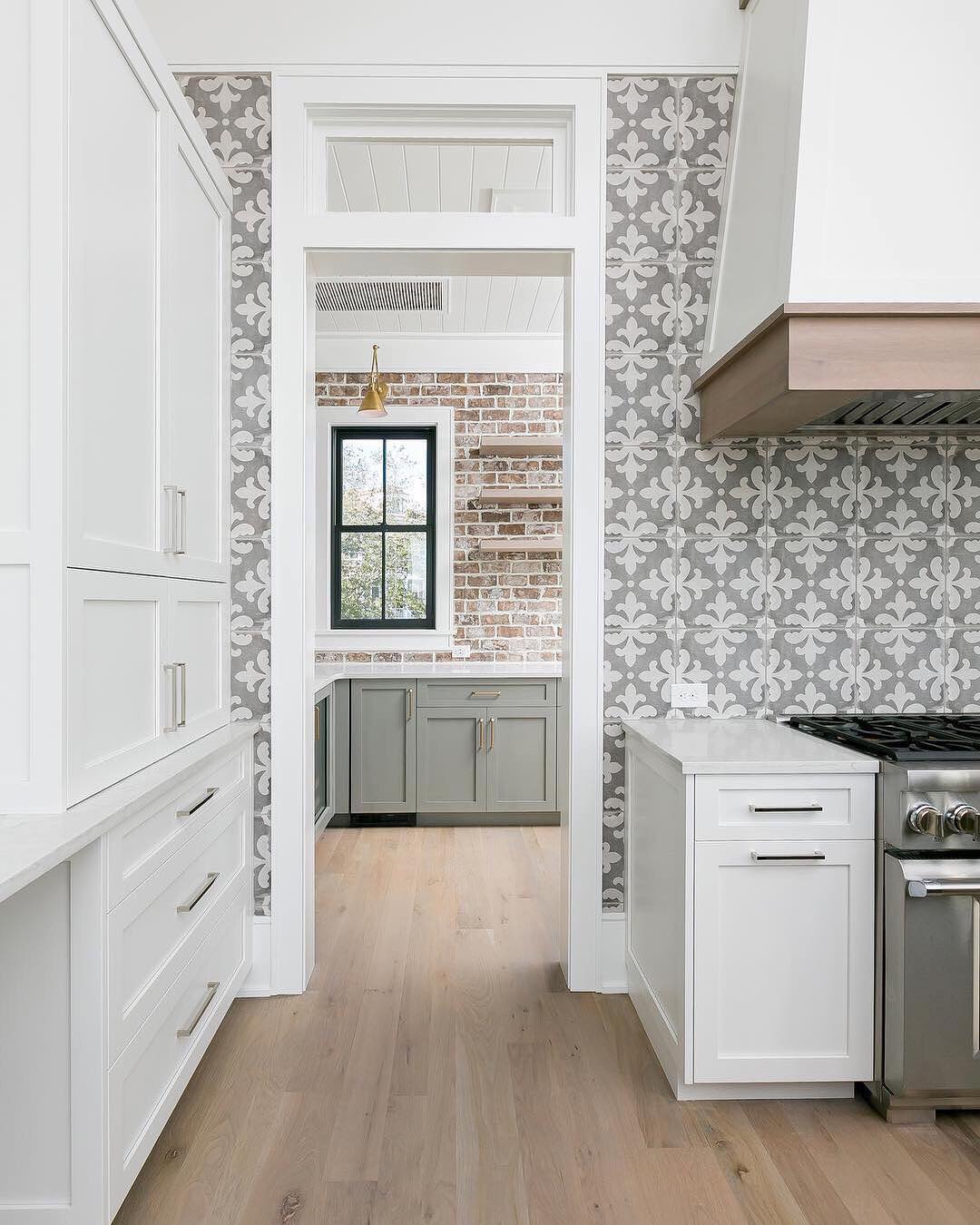 The tile, cabinets, floor and room decor brings this farmhouse-styled space together | Tile: Remy 8x8 cement tile in Damsel and Costa Allegra 3x6 ceramic tile in Cinder | Designer: @desertdecor