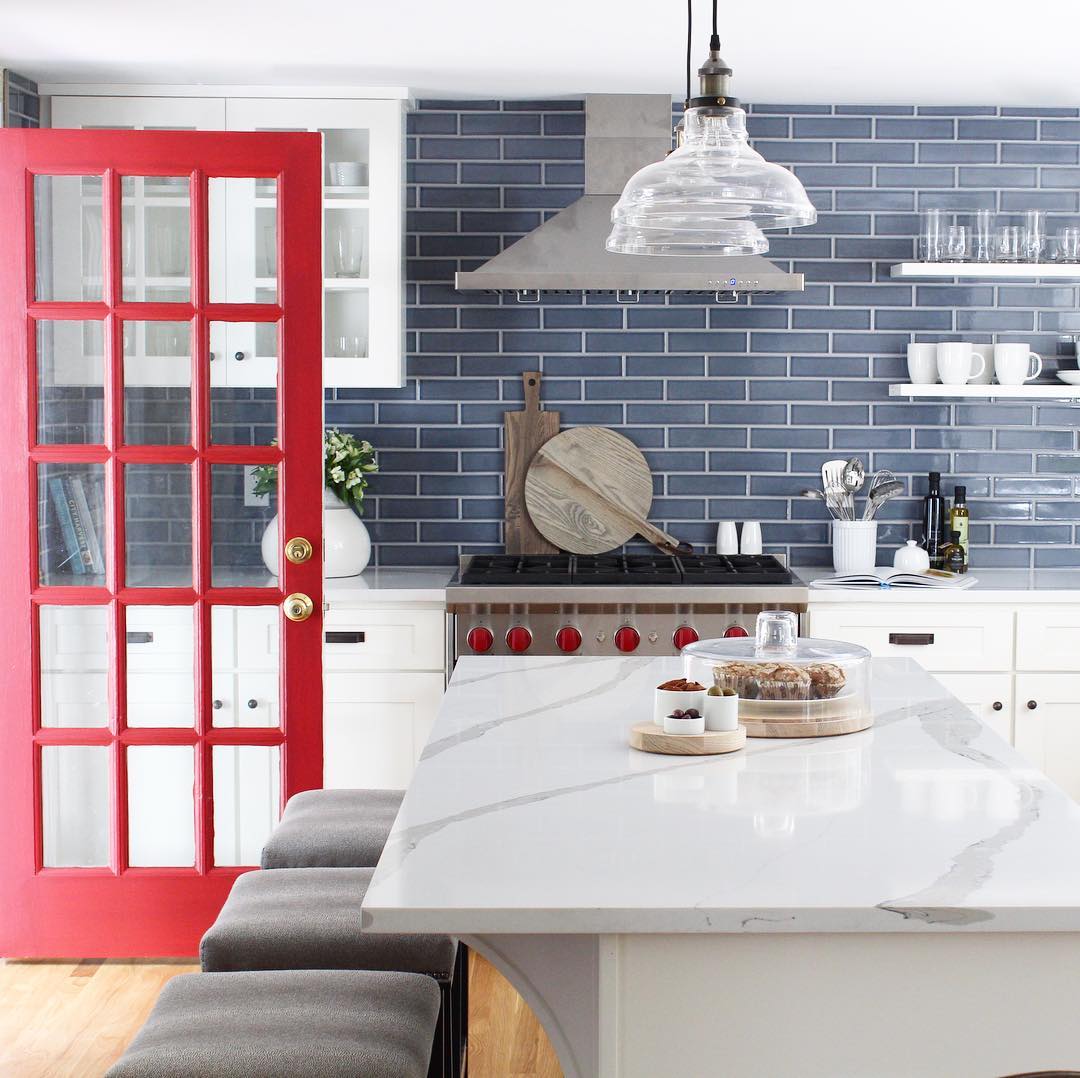 The blue in our porcelain tile Enchante in Charm adds a cheerful touch to this kitchen