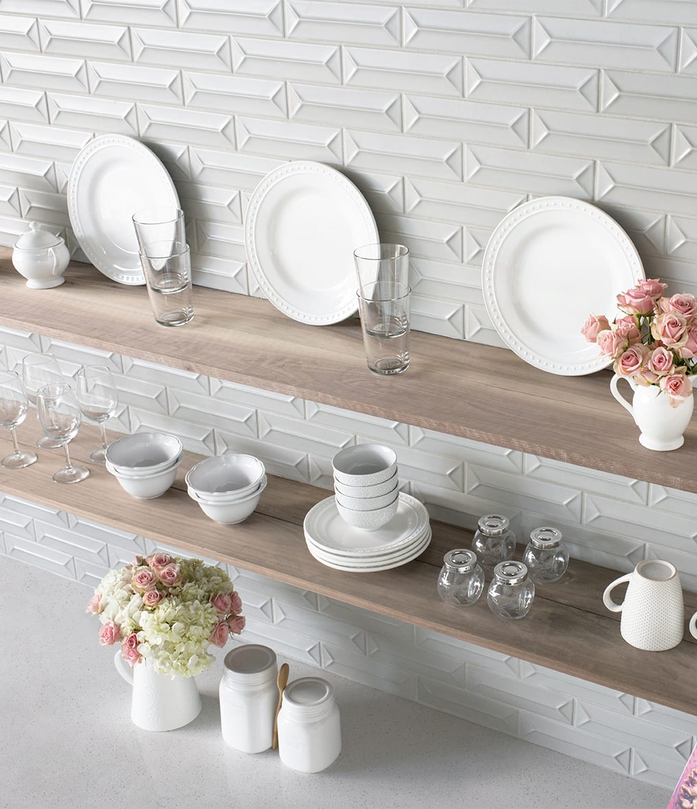 Instead of tiling the whole wall, consider going half way up the wall and adding open shelving above. Seen here is our Costa Allegra 3x6 ceramic wall tile in White Sand | Designer: @signe_lauren
