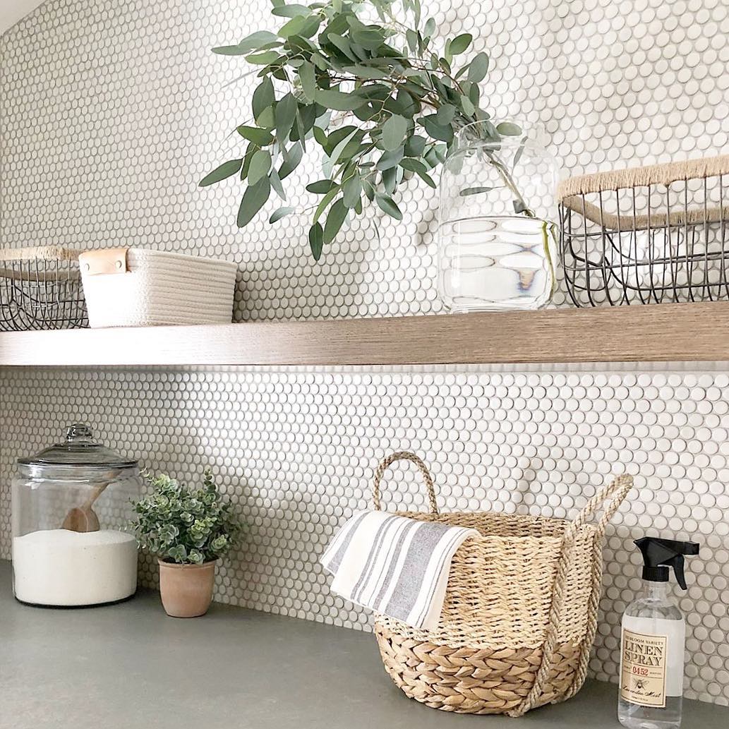 Our 360 penny round tile in Off-White is a more unique backsplash option that is a little more expensive than simple 3x6 field tile, but delivers an incredible impact. Source: @eyeforpretty