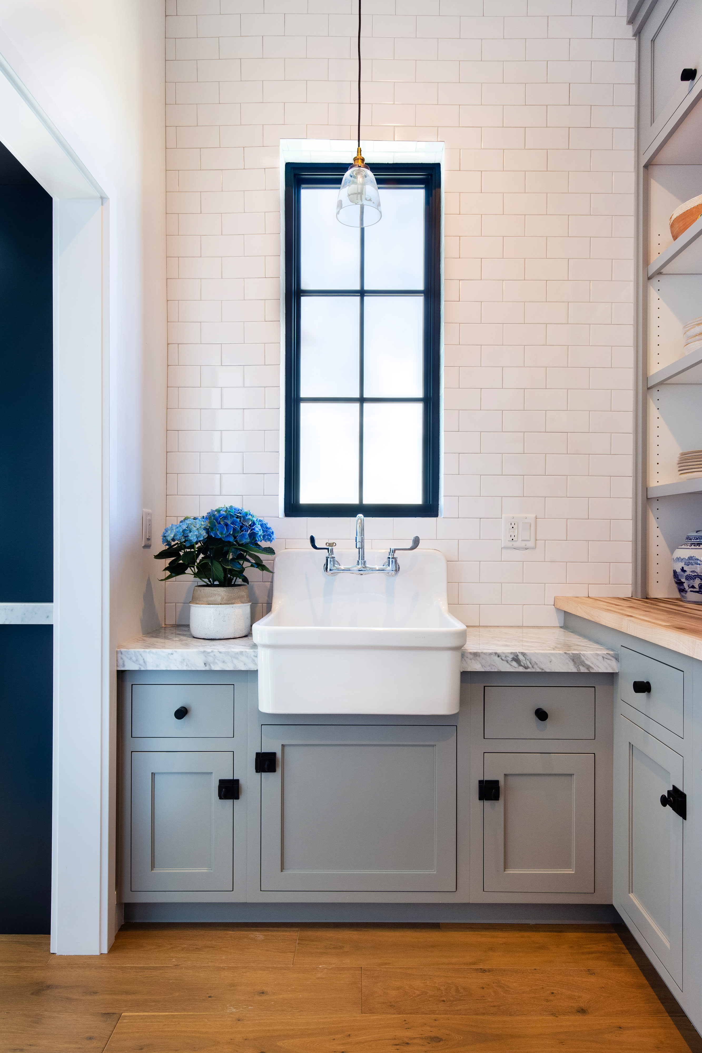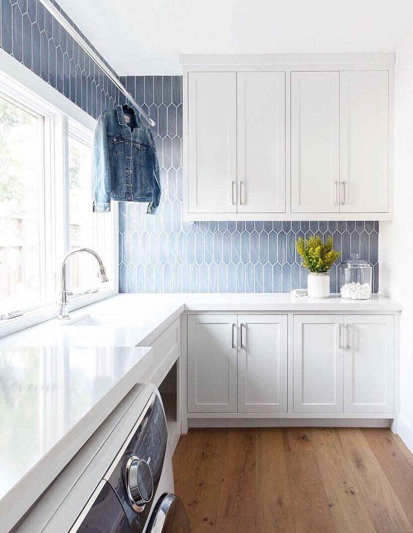 The perfect shade of powdery blue for this laundry room designed by @lindyegalloway. The picket shape adds a fun, unexpected element to the space. Get the look with our collection Reine! Photo: @daviddlivingston