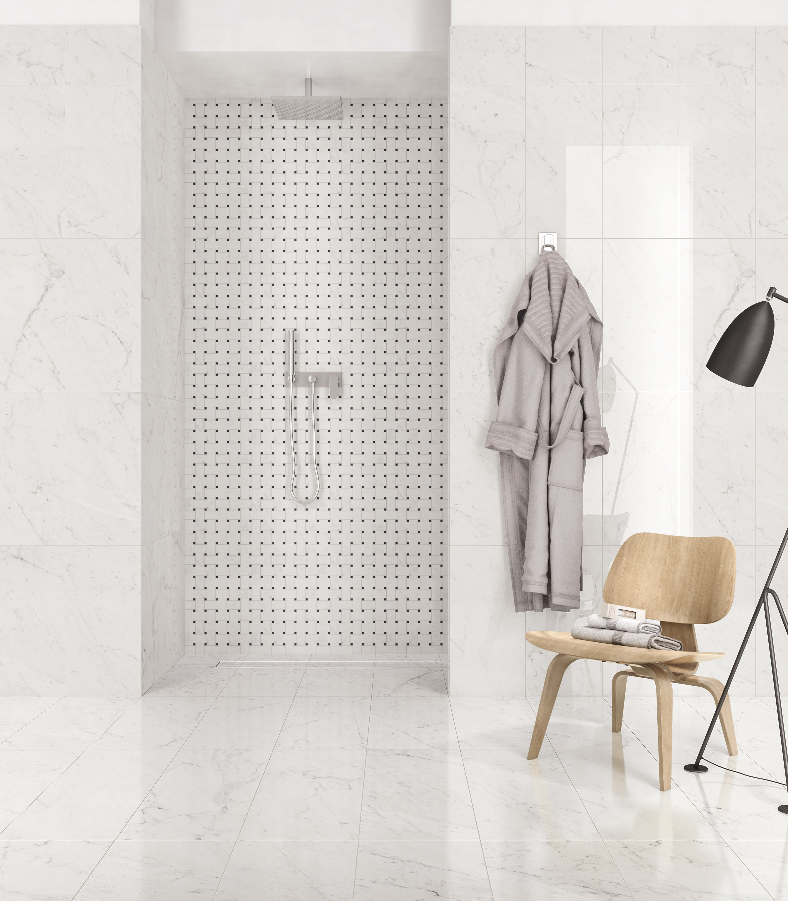 Main floor: Classic 2.0 polished 12"x24" porcelain in Bianco Carrara | Shower wall: Classic 2.0 polished Basketweave mosaic in Bianco Carrara