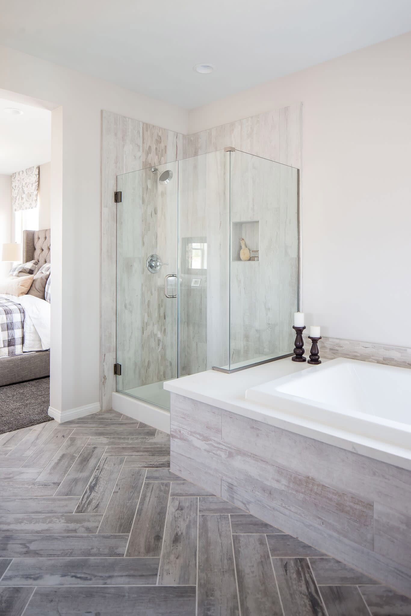 Floor and walls: Crate 6"x24" wood-look porcelain in Weathered Board