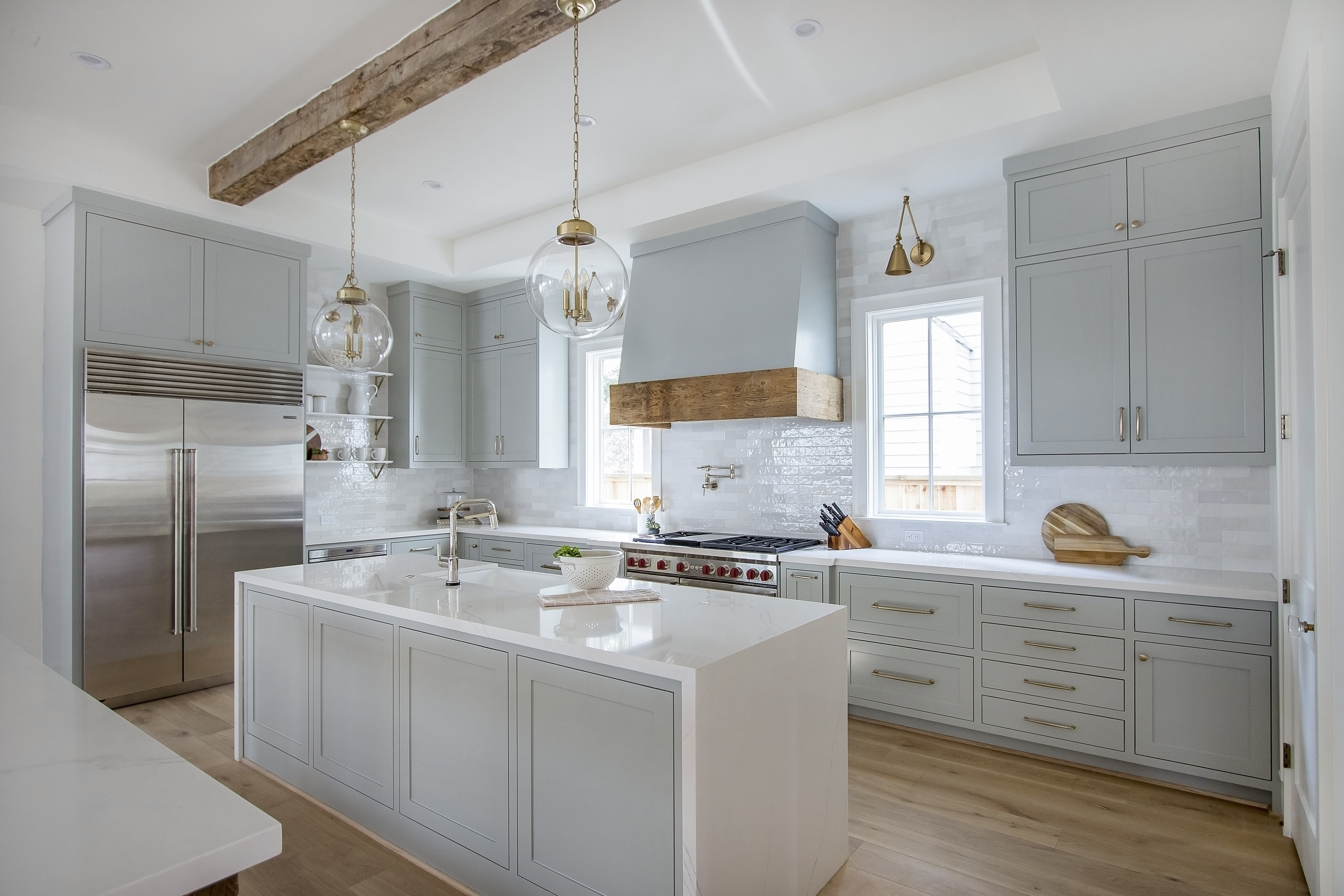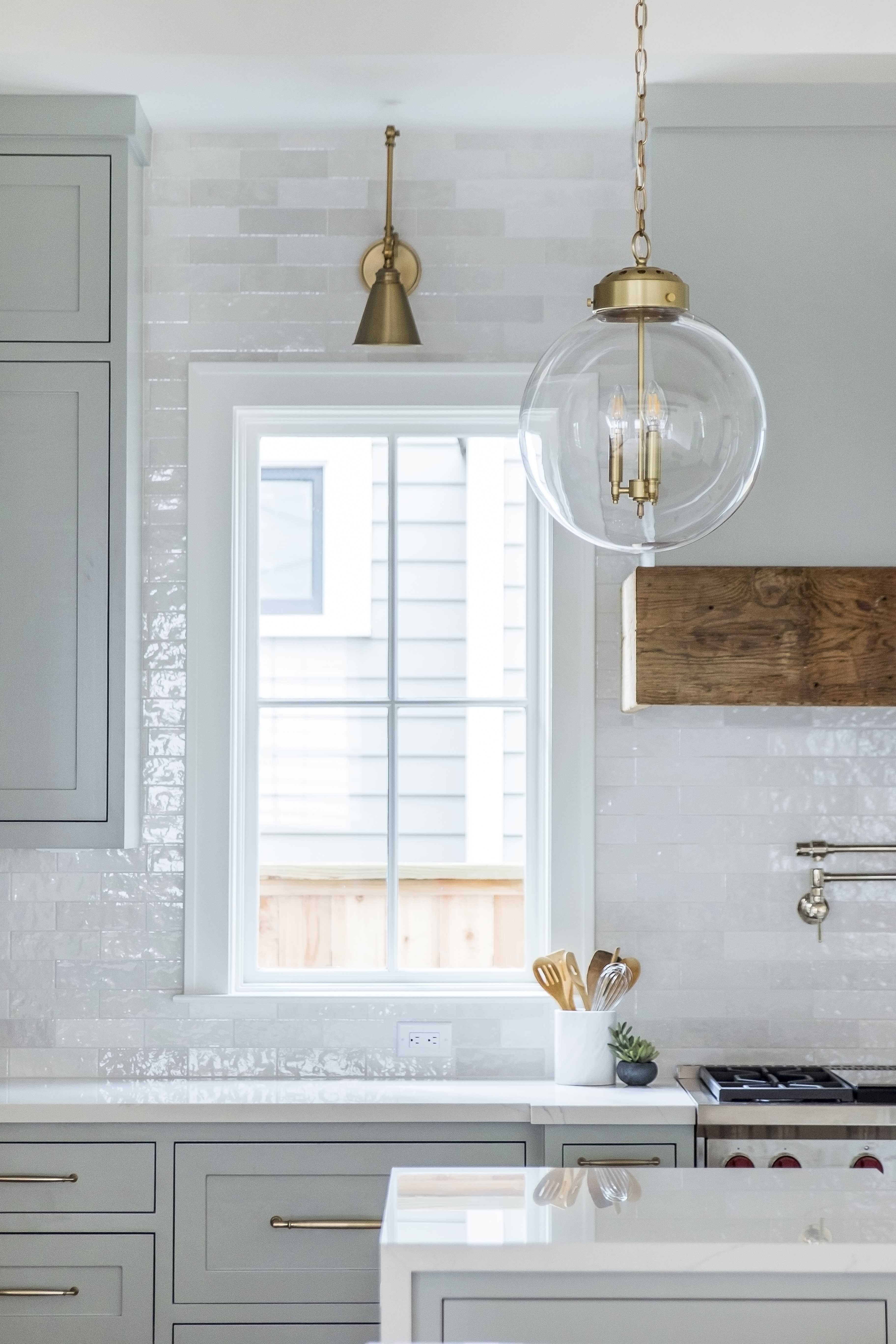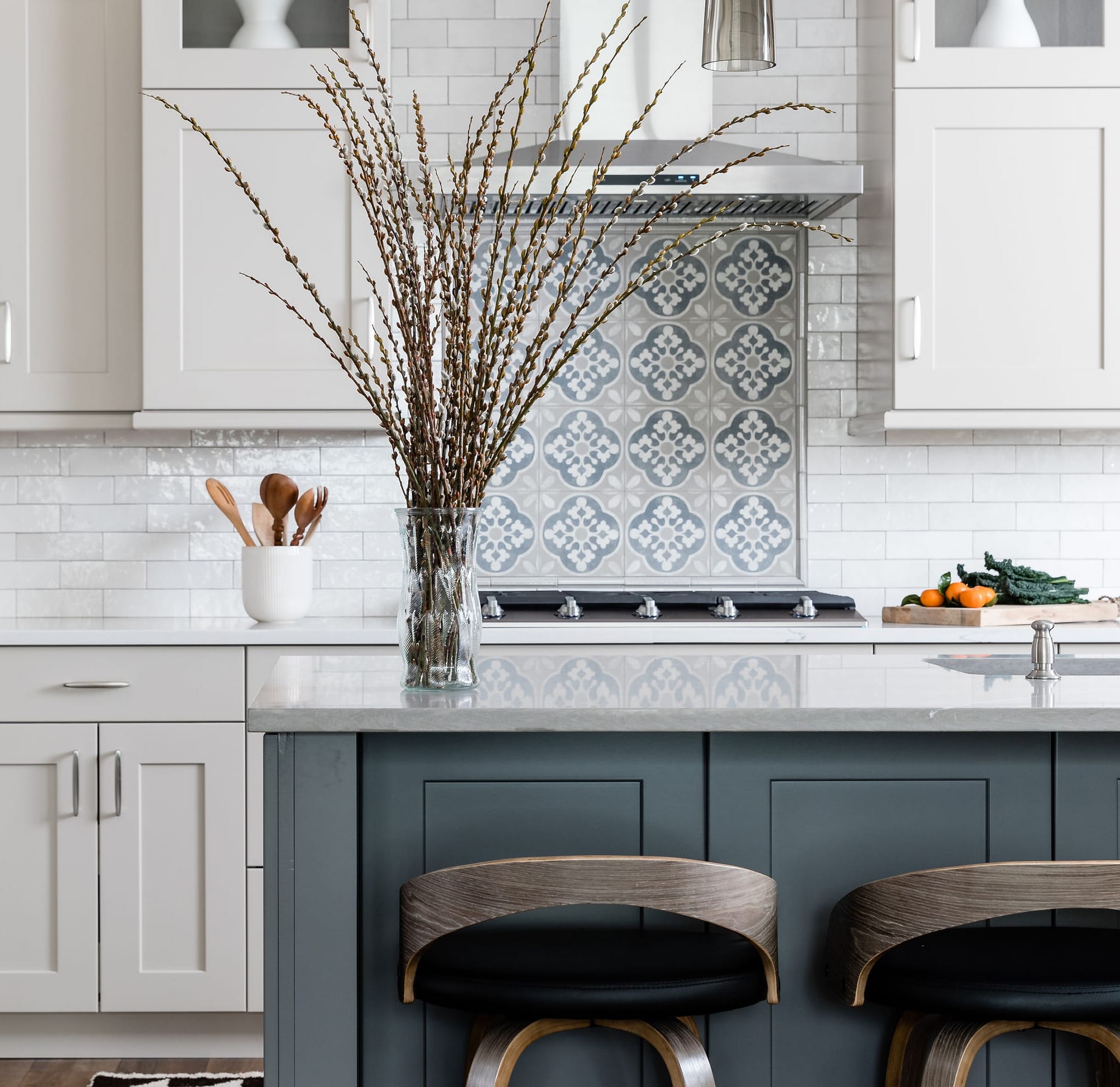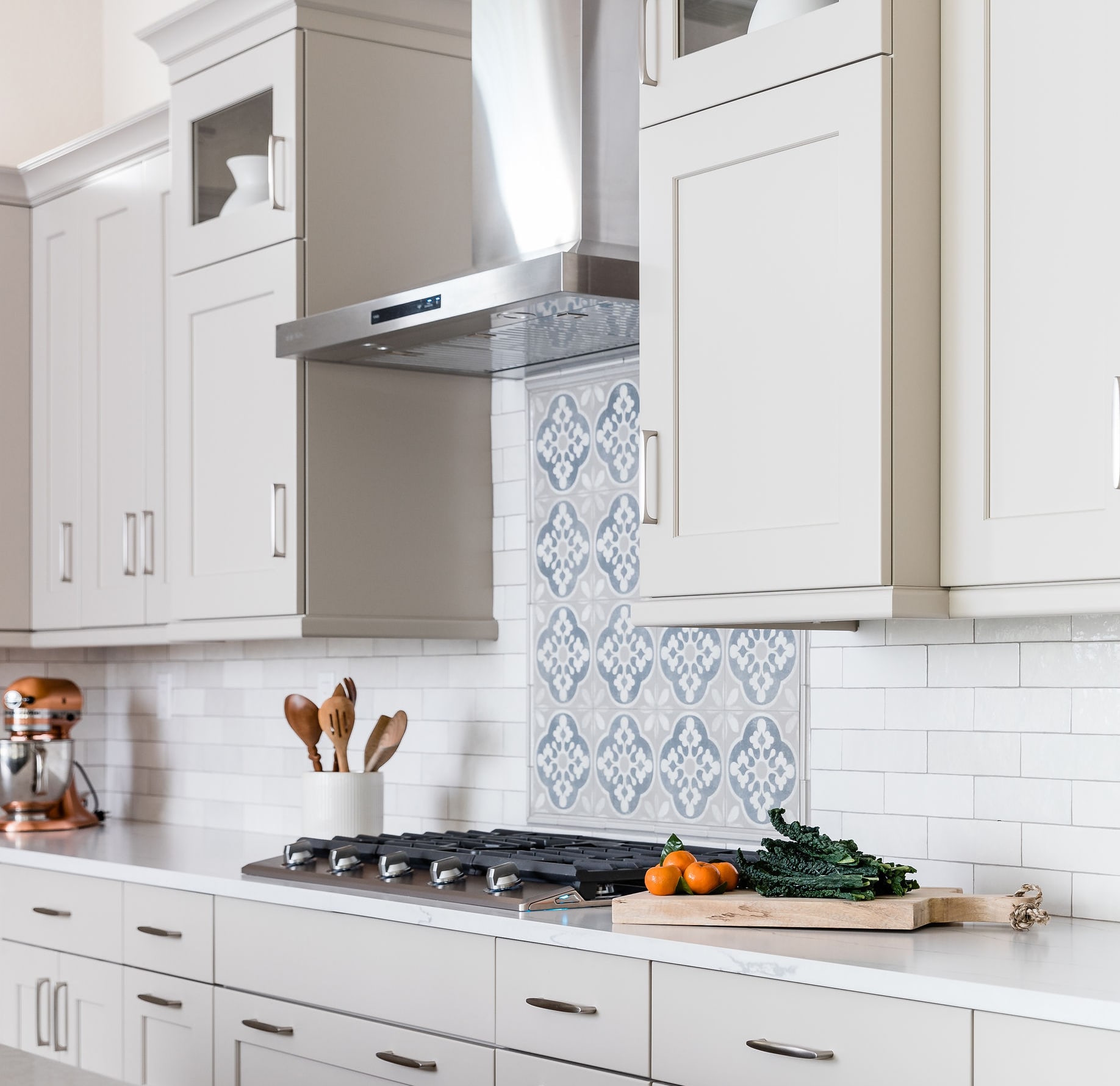 For this project, the grey grout choice also blends well with the blue and grey colors of the accent tile Enchante Charm used behind the stove and the dark blue island. Grout color can not only be used to complement the tile itself, but also tie together other colors used in the space.