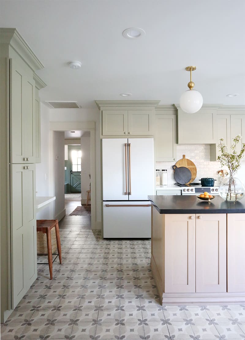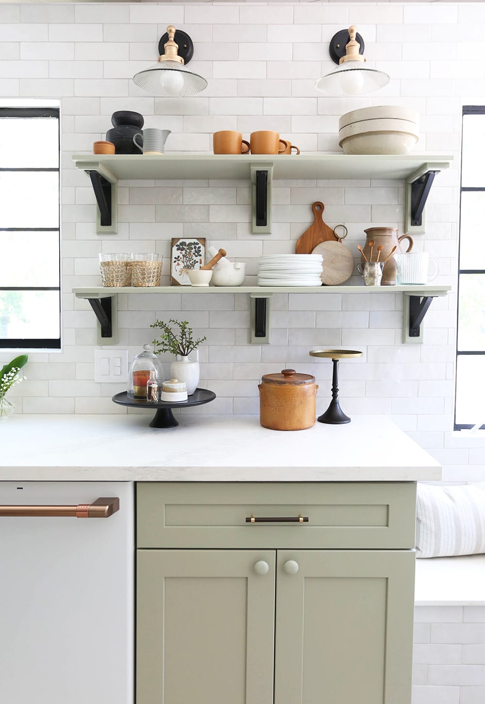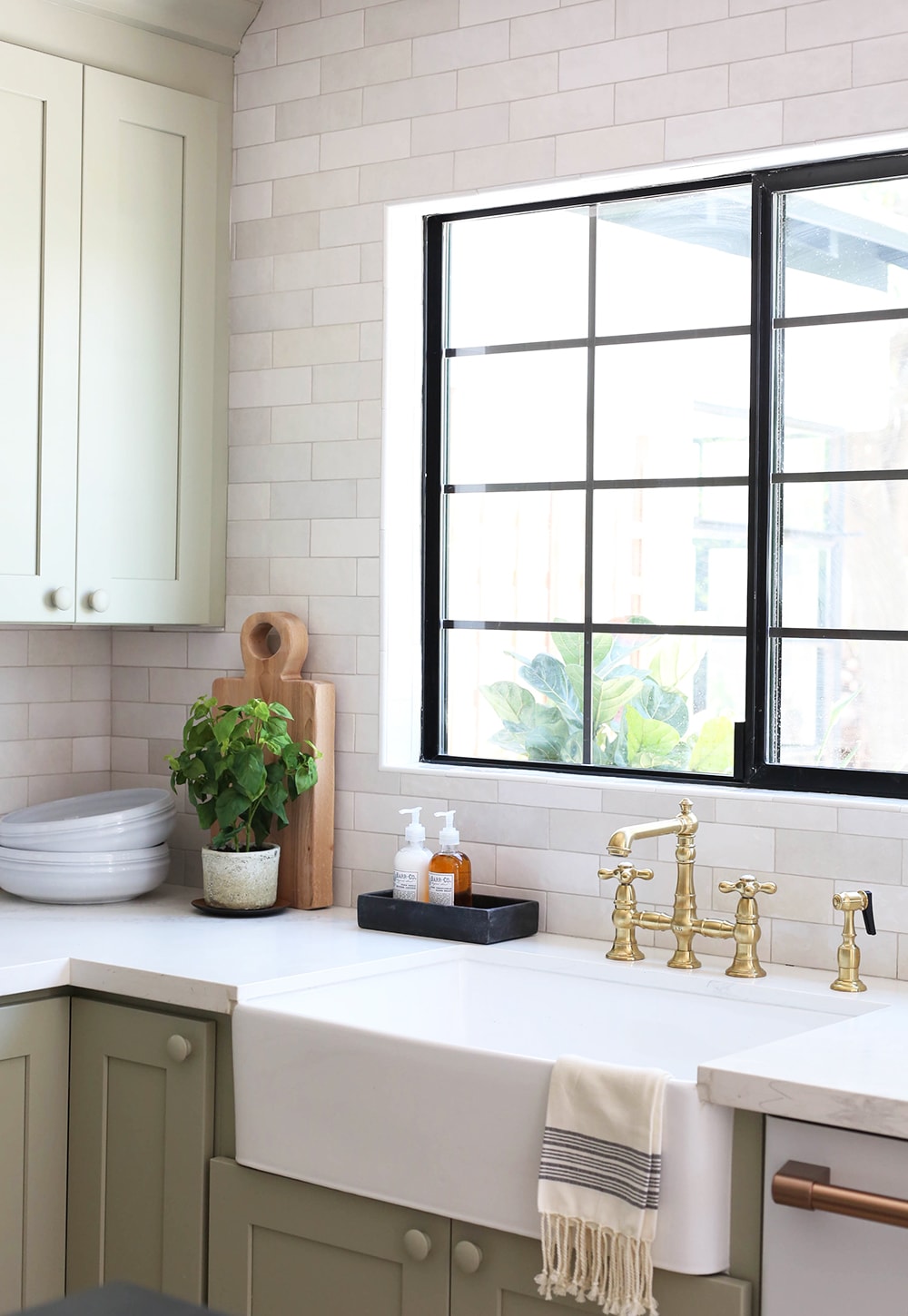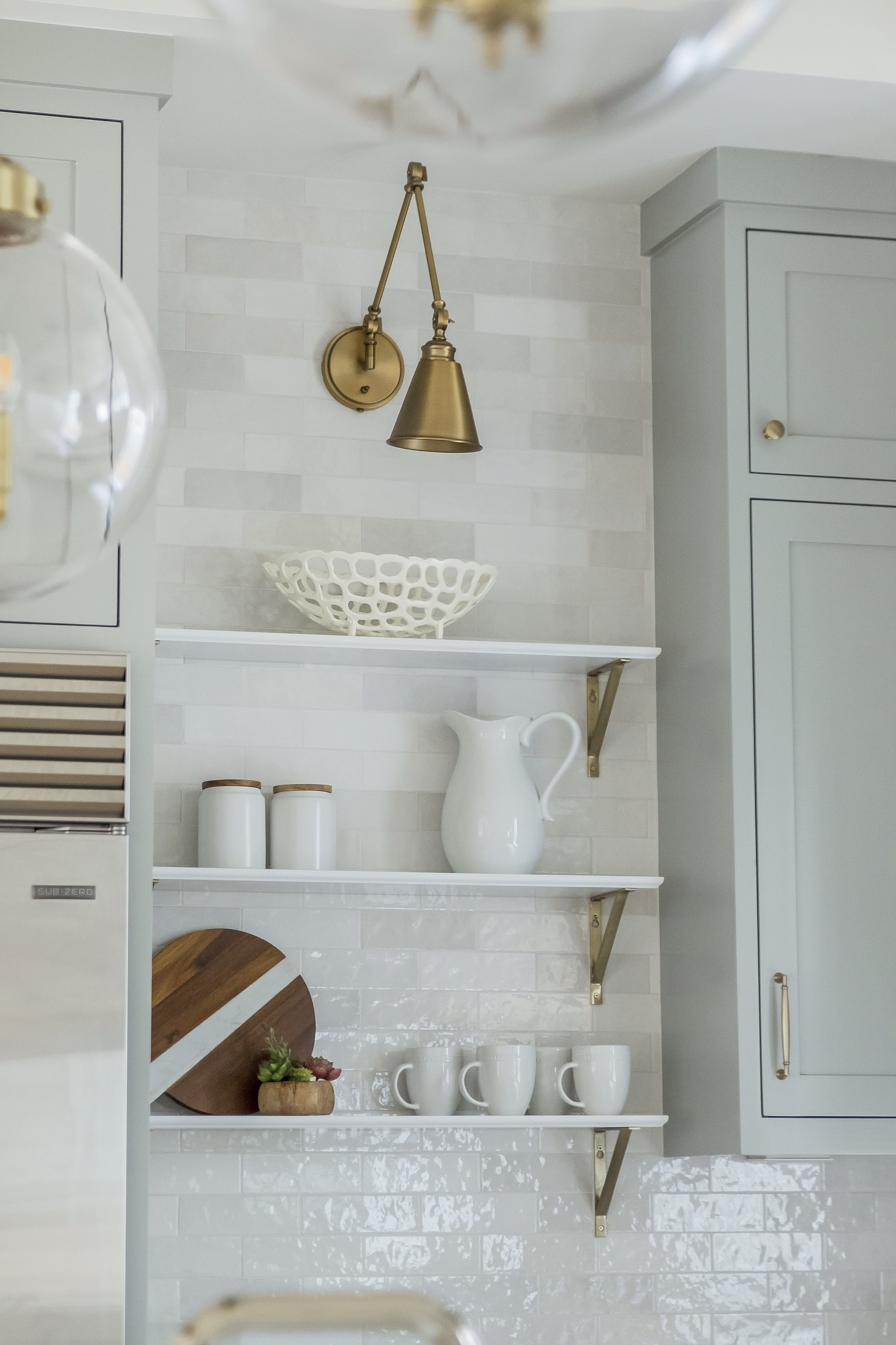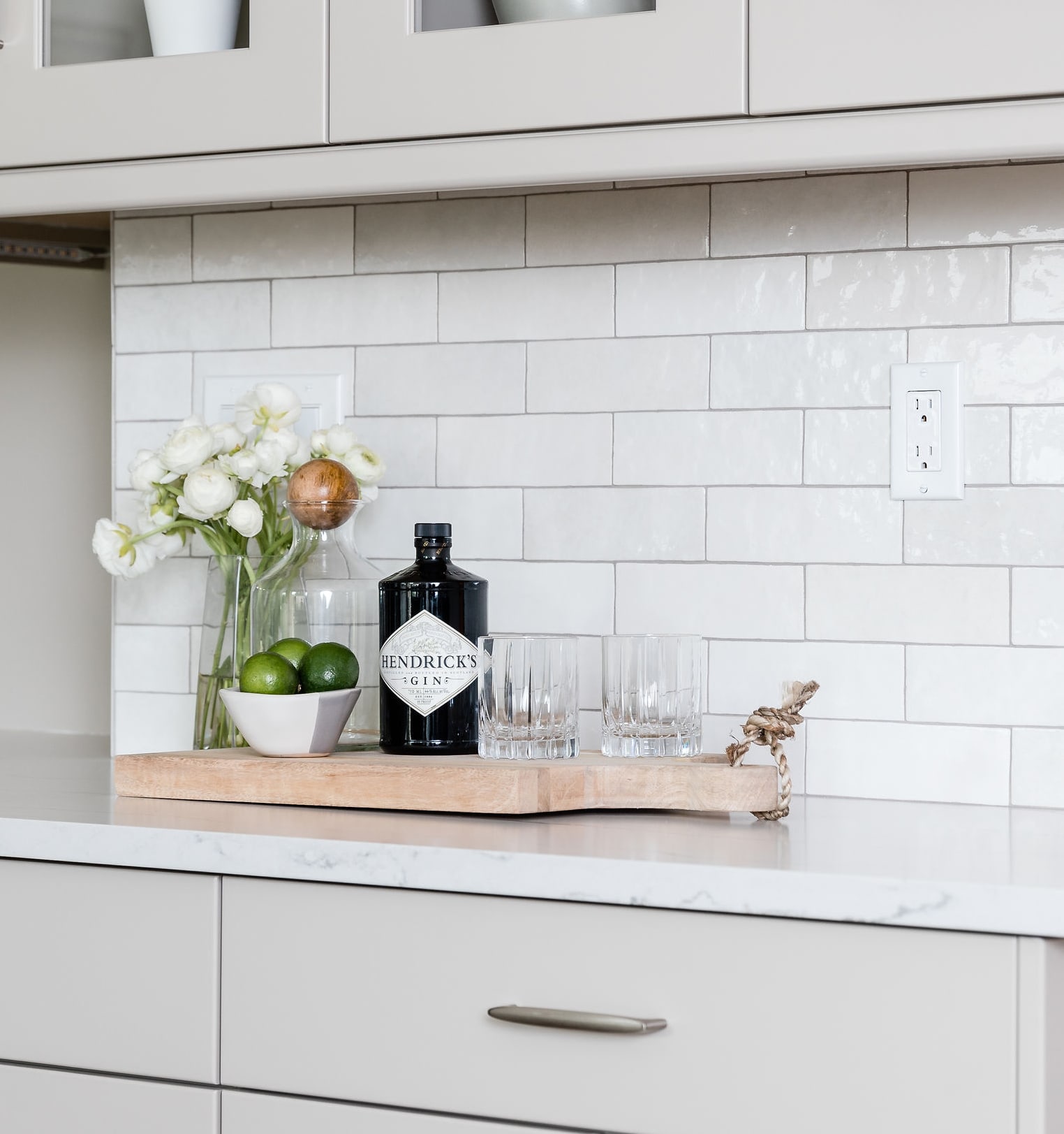House flipper Jenny Komenda designed a kitchen with white, warm beige and tan colors with Cloe in White as the wall tile, even using it on the bench of the breakfast nook. She chose an alabaster-colored grout to give detail to the tile that helped bring the warm colors in the room together.