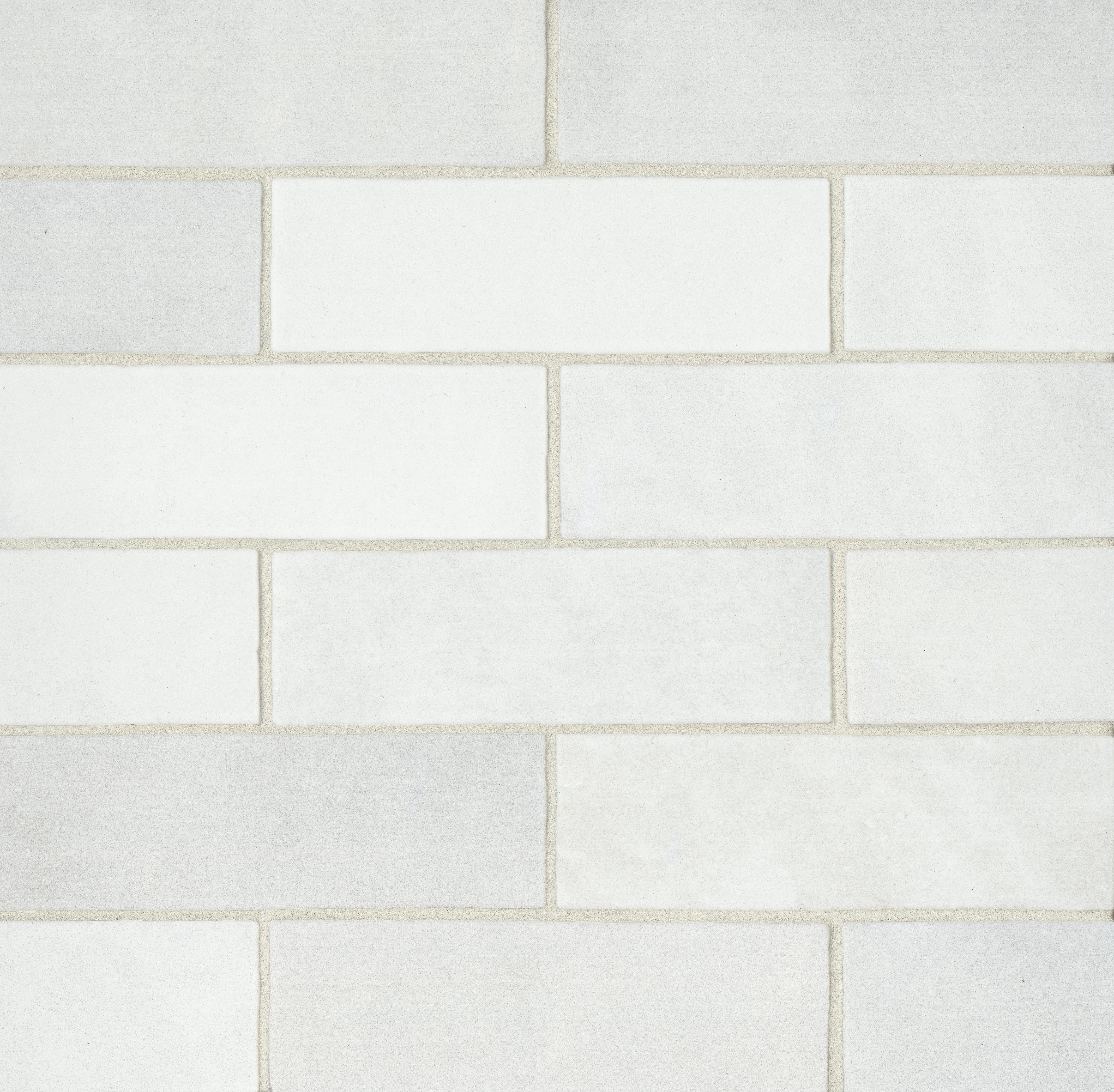 Cloe 2.5"x8" ceramic tile in White with a light grey grout defines the shape of the tile
