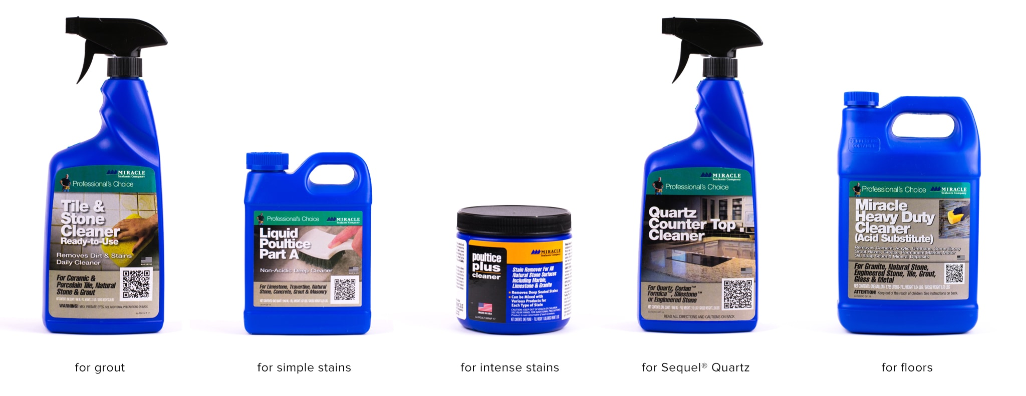 For general cleaning, Miracle Sealants Cleaners can be used as directed on any type of natural stone, ceramic/porcelain tile or grout. For soap scum, hard water build up, efflorescence or heavy dirt buildup Miracle Sealants Heavy Duty Acidic Cleaner can be used as directed. This type of cleaner should NOT be used on acid sensitive natural stones (polished marble, limestone or travertine). For acid-sensitive surfaces, use Heavy Duty Acidic Cleaner (Acid Substitute). For porcelain and ceramic tile, you can use Porcelain and Ceramic Tile Cleaner to clean soap scum and buildup.