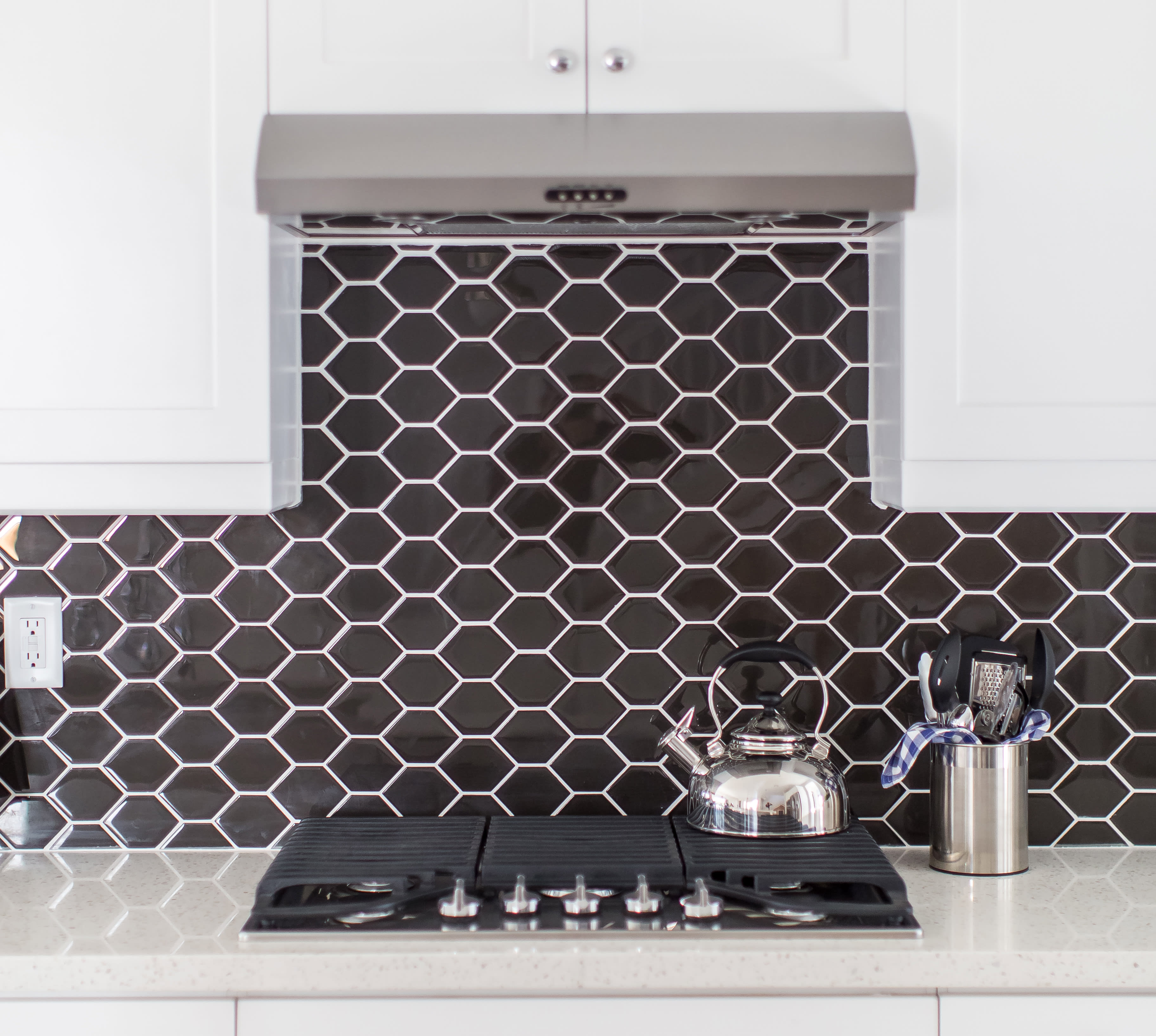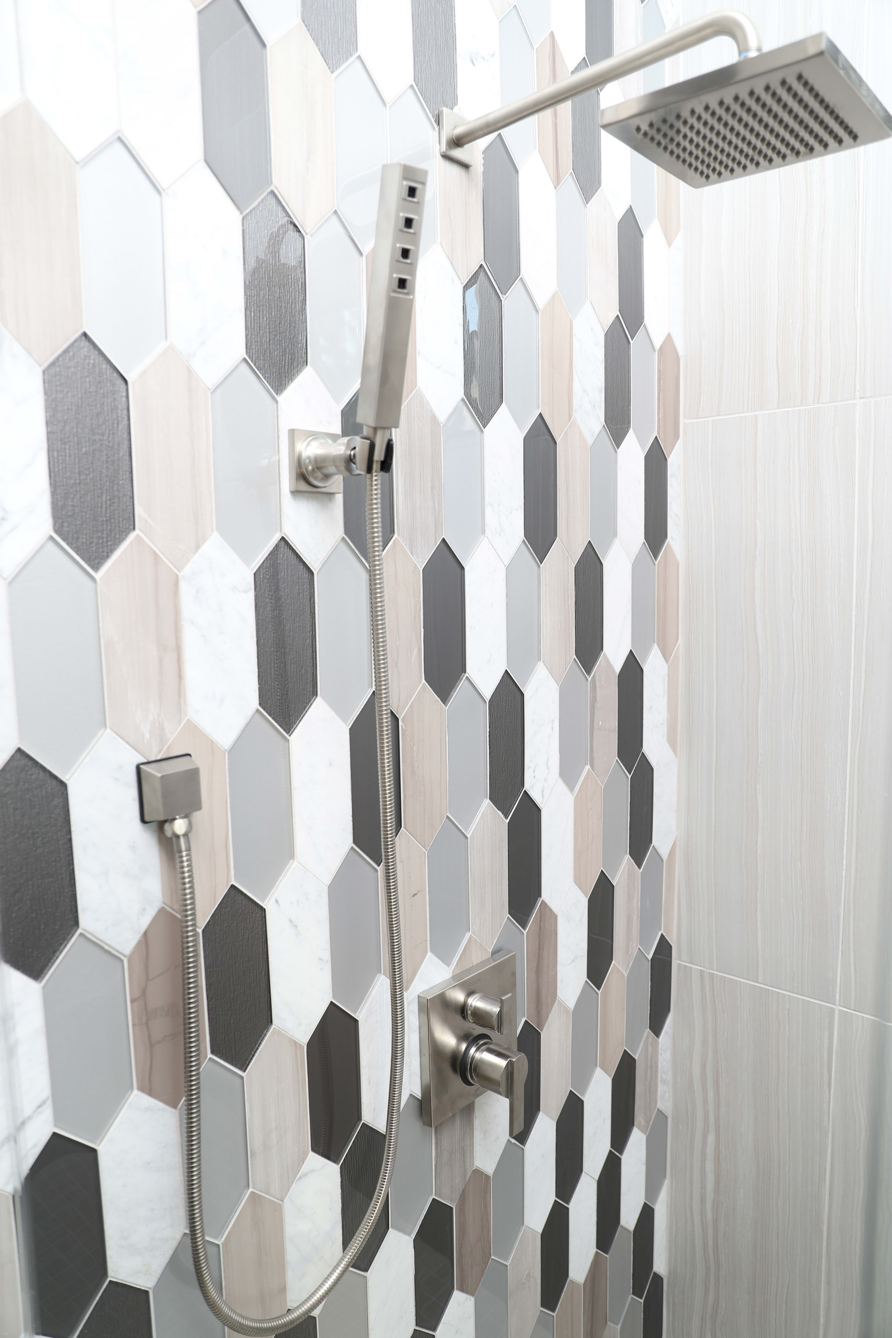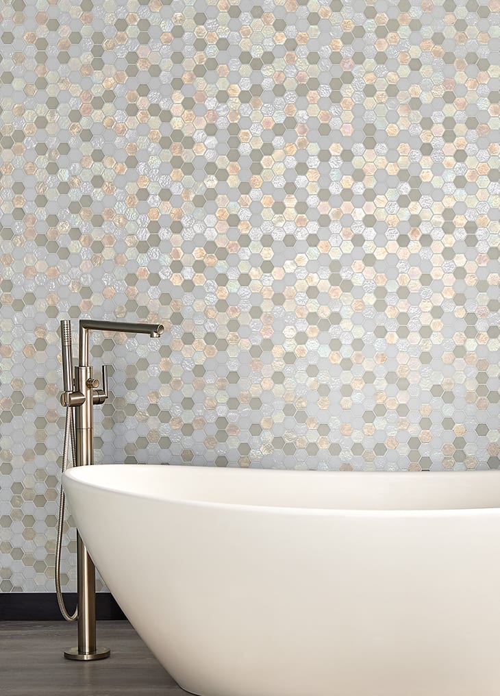 You don't have to stick with one material or color with your hexagons. Many options come in blends of glass and stone or different combinations of stone and surface textures.
