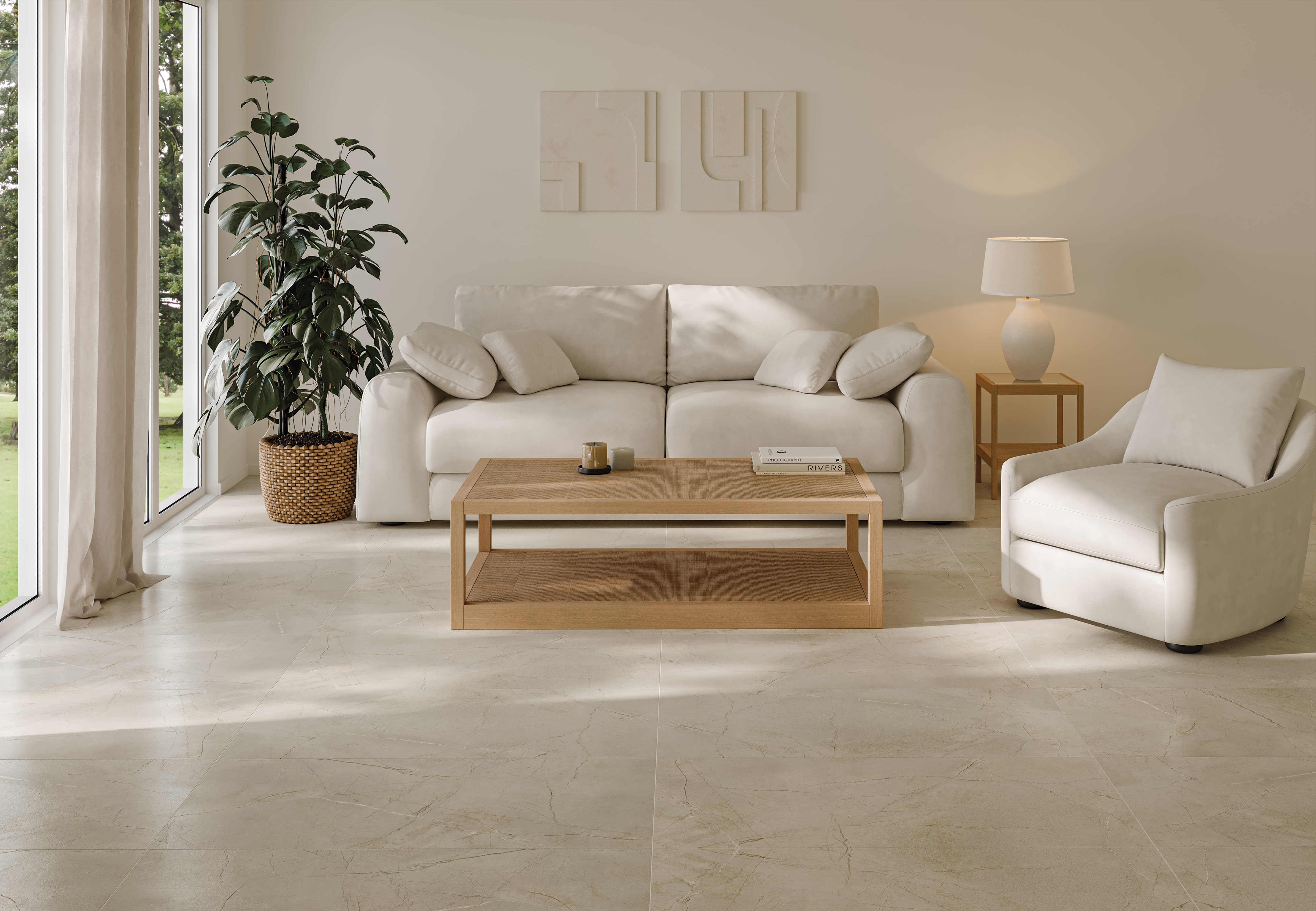 Photo features Crema Marfil 24" x 48" Satin Porcelain Field Tile