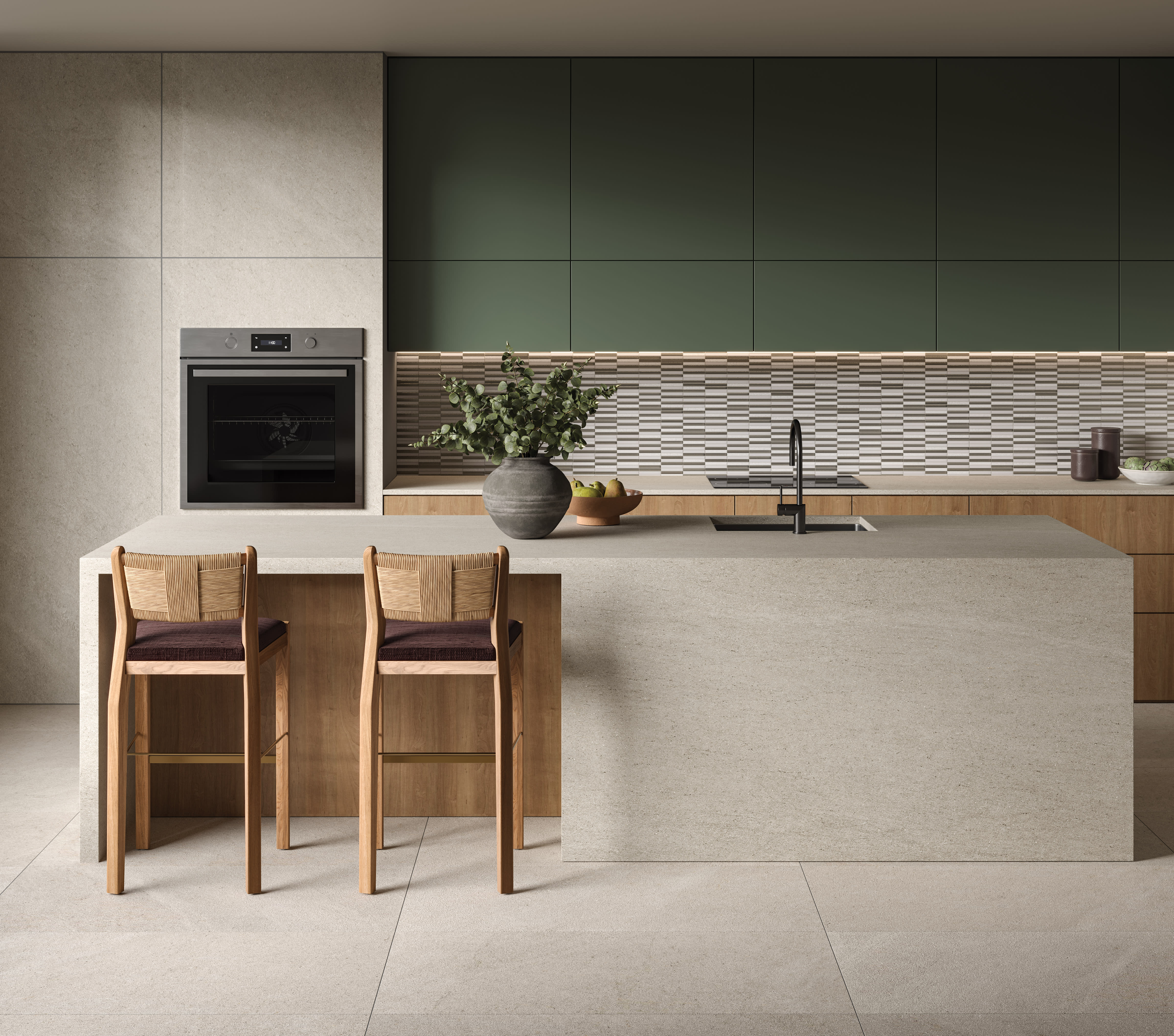 Photo features Kaikos 3/8" x 4" Stacked Glass and Stone Mosaic in Grey and Oriental White, Magnifica 24" x 48" - 8mm Honed Porcelain in Basalt Sand, and Magnifica Encore 60" x 126" - 12mm Honed Porcelain Slab in Basalt Sand