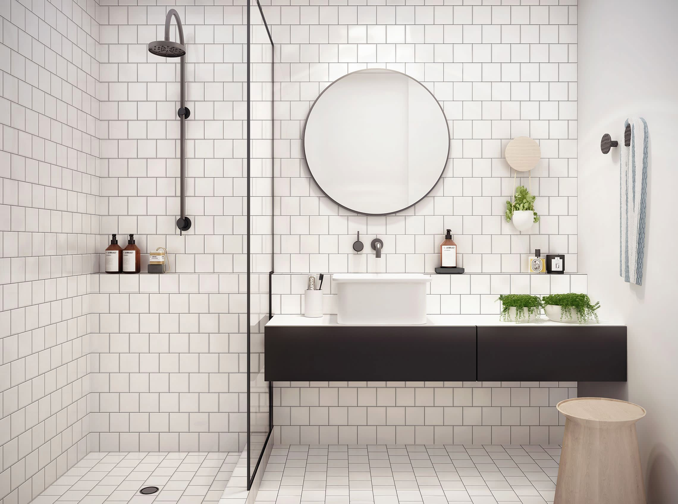 Bathroom/shower floor: Le Cafe porcelain 2"x2" hexagon mosaic in White matte and Black matte | Walls: Traditions 3"x6" ceramic subway tile in Ice White matte | Source: Plank + Pillow