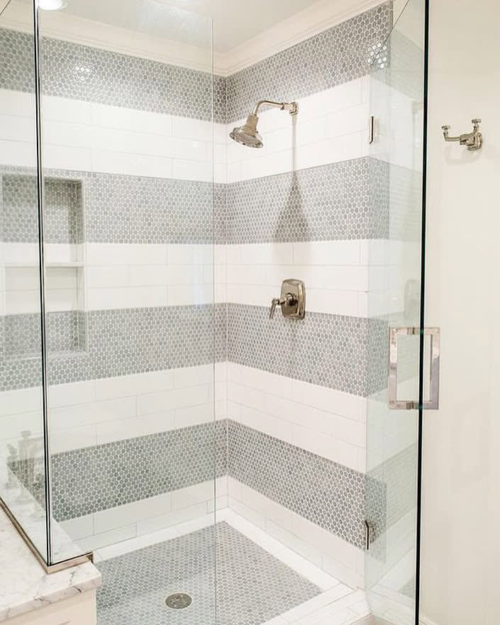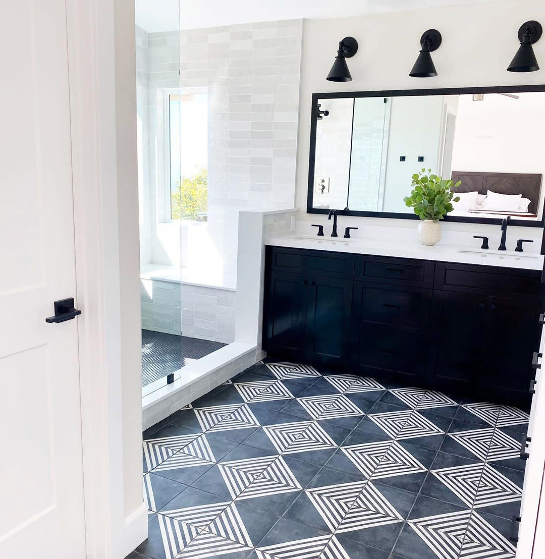 Shower walls: Cloe 5"x5" ceramic tile in White | Get the look of the bathroom/shower floor with Chateau 12"x24" porcelain tile in Smoke | Chateau 2"x2" porcelain mosaic in Smoke | Source: @lblimitedcompany