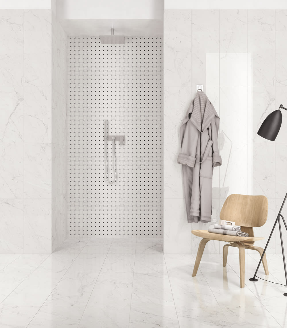 Get the look of these walls with 360 porcelain pennyrounds in Pumice and White