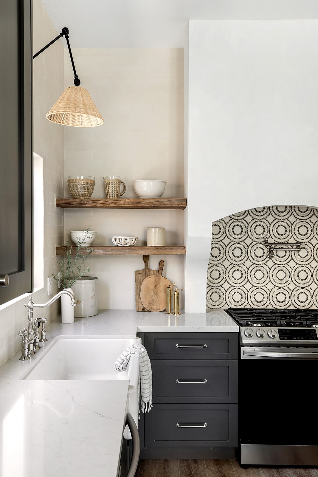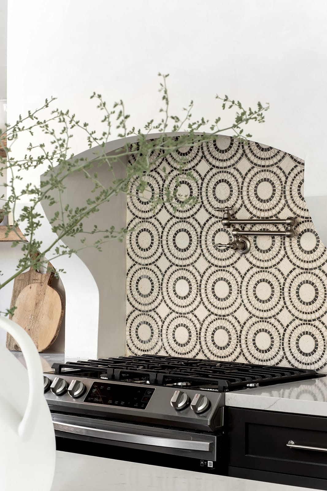 For the kitchen walls, Hagit chose Sahara 3”x12” porcelain tiles in white, from Bedrosians. The Sahara Collection evokes the spirit of the desert and was a natural fit for this space. Set back from the curved plaster hood of the range, Hagit created an old-world-meets-new focal point with Solis tiles in Myra Beige & Basalt color blend. Solis is a sun-inspired style from our Stone Mosaics Collection, featuring classic geometric shapes that form concentric circles.