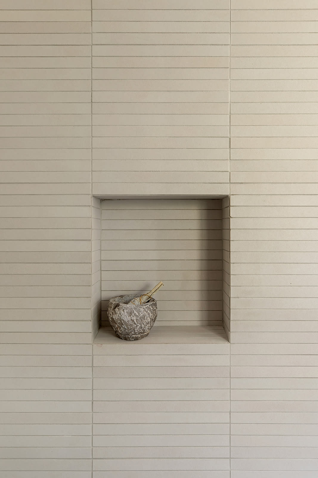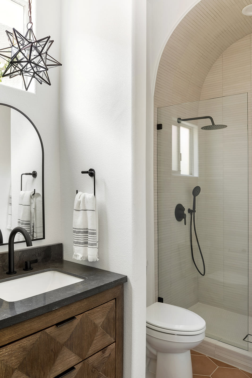 In keeping with an authentic Spanish concept throughout the home, the primary bath presented Hagit with an opportunity to bring lots of character to a small space. She began by giving the floor new life with Makoto Hex tiles in Umi Terracotta. And by arching the shower, she created a more open feel, then lined its walls from floor to ceiling with Sahara 1”x12” in white.