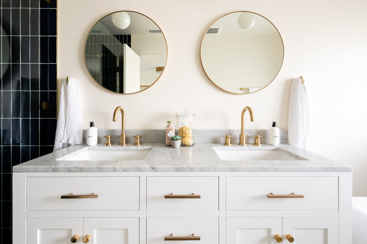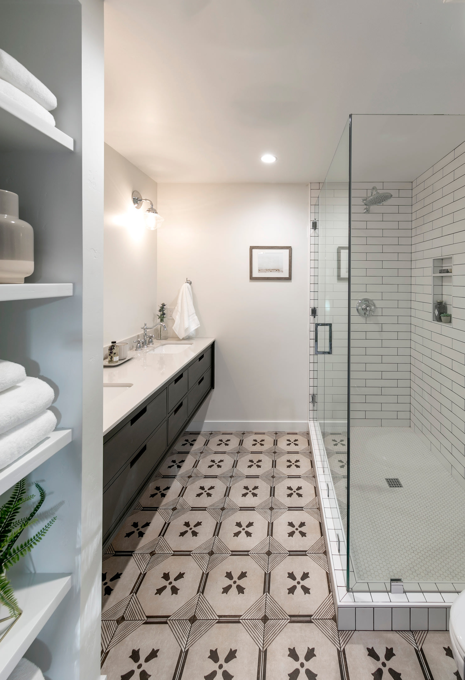 We used both blue and white subway tiles in a vertical stack pattern in a few of the bathrooms, and a bold black and white pattern on one of the bathroom's floors that we instantly fell in love with!