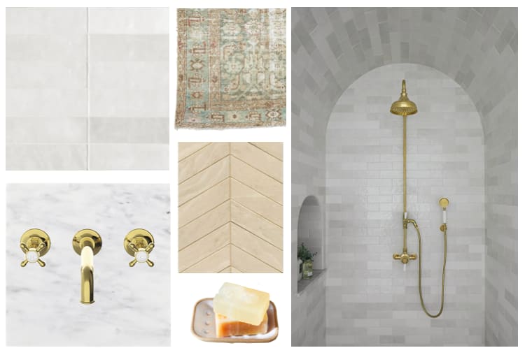 This is one of our mood boards for our Fleur House renovation! We used Cloe 2.5x8 in White. We used Waterworks faucets and shower system to elevate the space and tie all the vintage inspired details together.