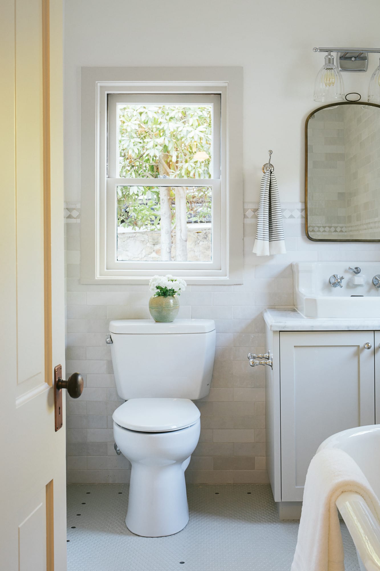 Cloe 5" x 5" Ceramic Tile in White | Pottery Barn Bathroom Vanity | Moen Weymouth Bathroom Faucet