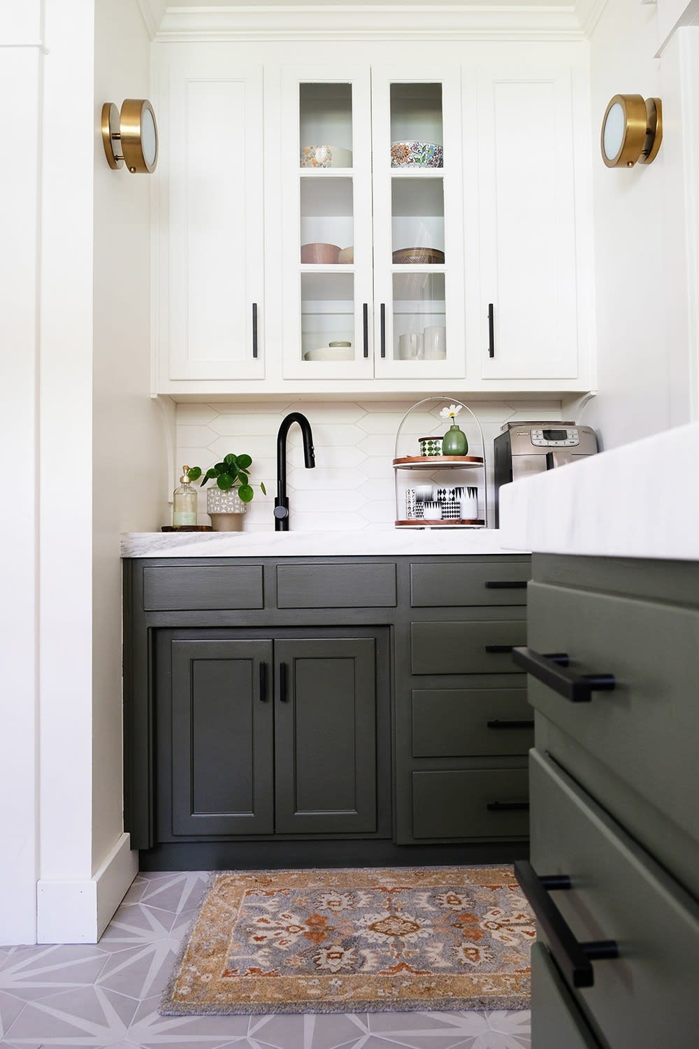 "Oh man the tile is gorgeous you guys. And one point in this renovation I thought I might just save some money and just keep the floors as is. Oh gosh I’m glad I changed my mind. These hex tiles from Bedrosians make this room! The backsplash is even better then I thought it would be and I’m so happy that I went with the matte white finish. The room feels so much bigger and brighter with light countertops and light backsplash. It’s amazing the difference it makes," Jeran said about her tile floors and backsplash.