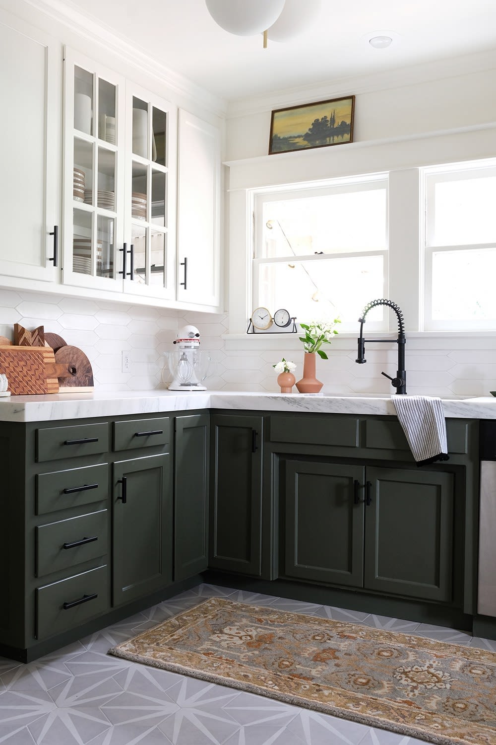 It was Jeran's plan to create a Californian Craftsman Kitchen. That meant mixing up the warm wood tones in her home with cool paint colors and neutral tile and stone combinations.