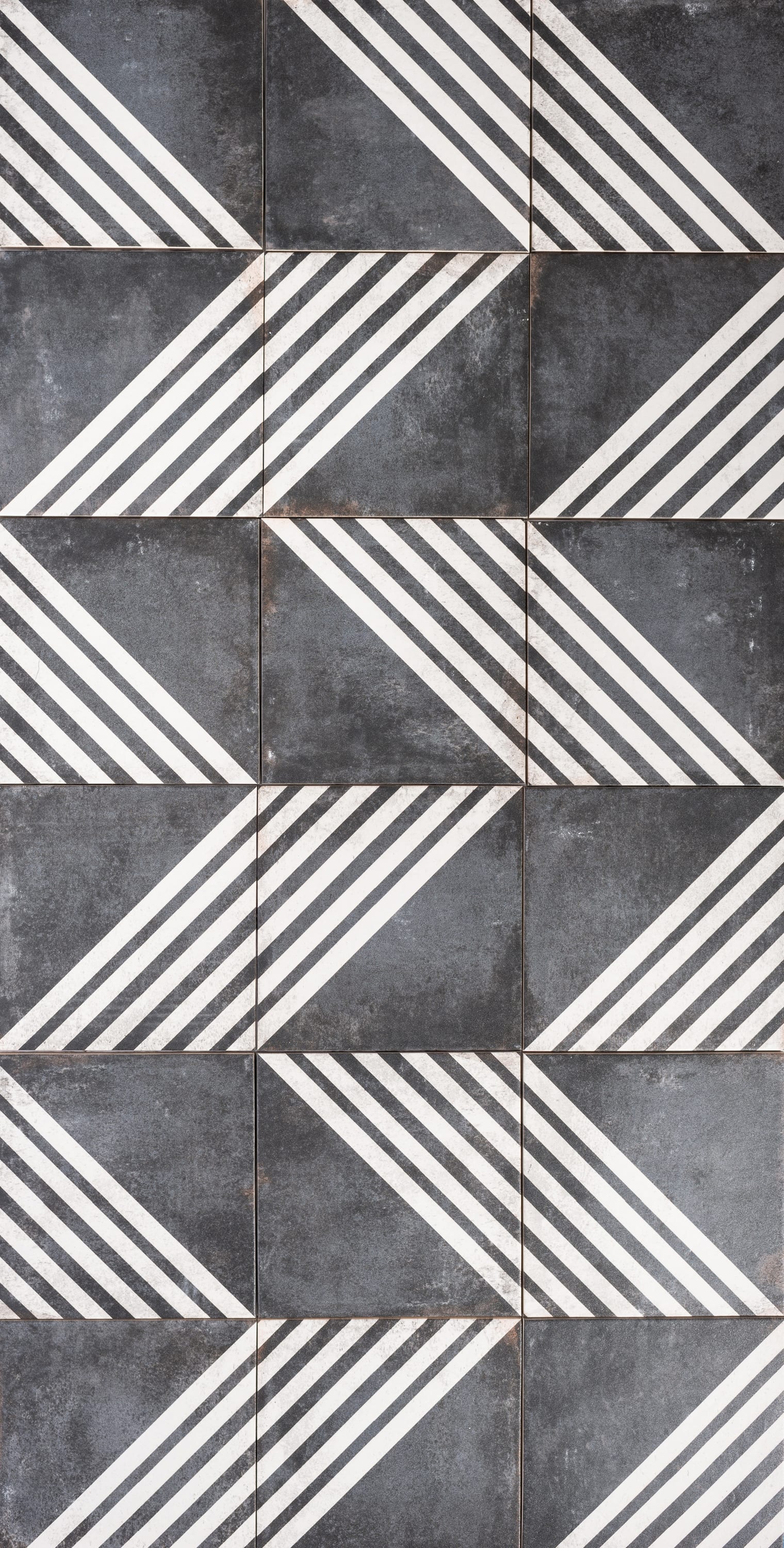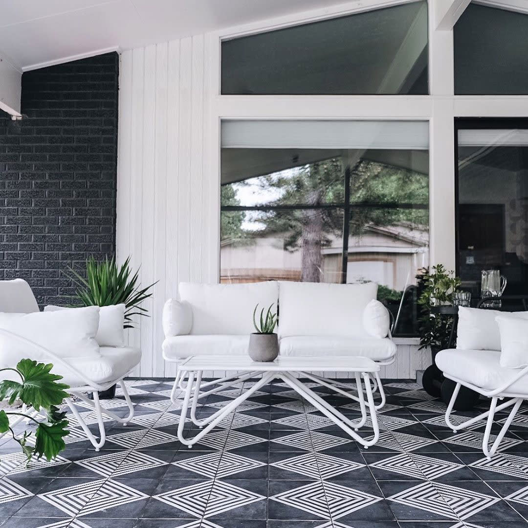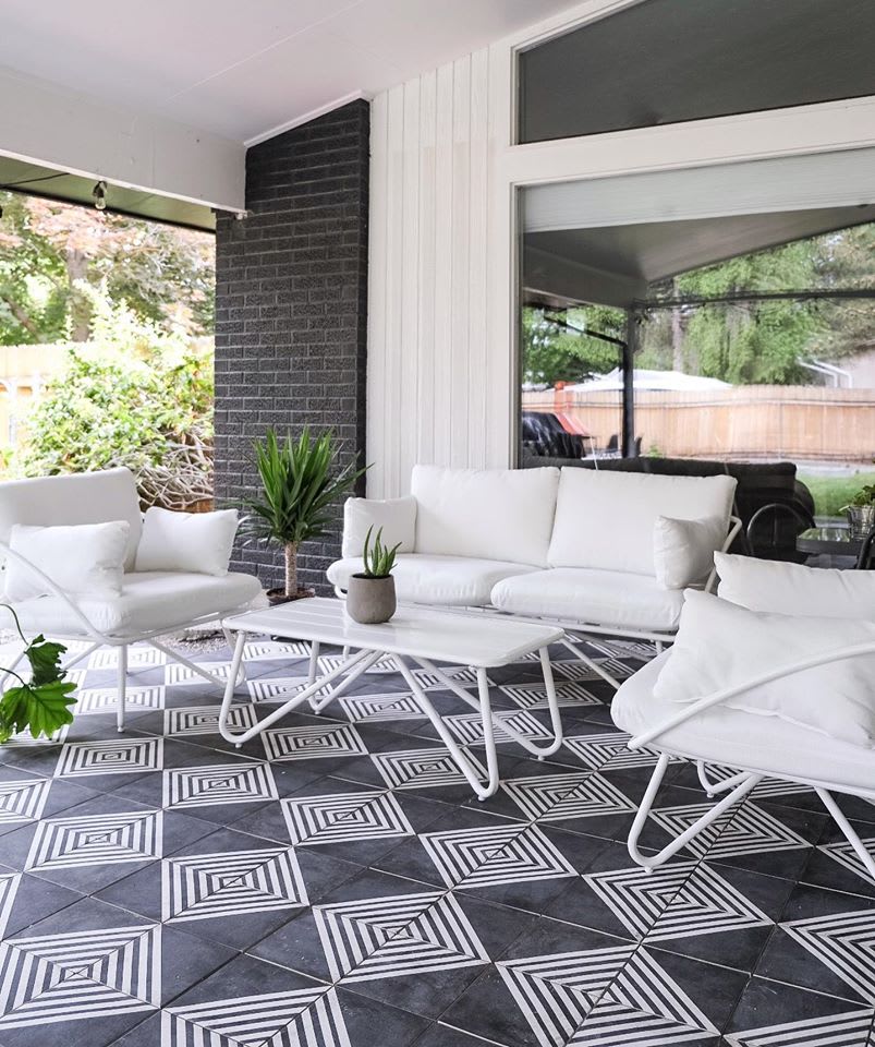 Interior stylist and author, Kirsten Grove, of Simply Grove in Boise, ID, was looking to create a European approach to her patio and home's entryway that would feel timeless and not trendy. She chose to tile these spaces with our Vivace 9"x9" porcelain tile in the Caviar Roads pattern. This particular black tile is divided in half on the diagonal with six white stripes on one side and a solid black triangle on the other. Depending on how you set the tile, you can create several patterns. We love how Kirsten found two ways to style her tile. She created huge striped and solid diamonds on her patio and an eye-catching geometric pattern for her home's entryway.