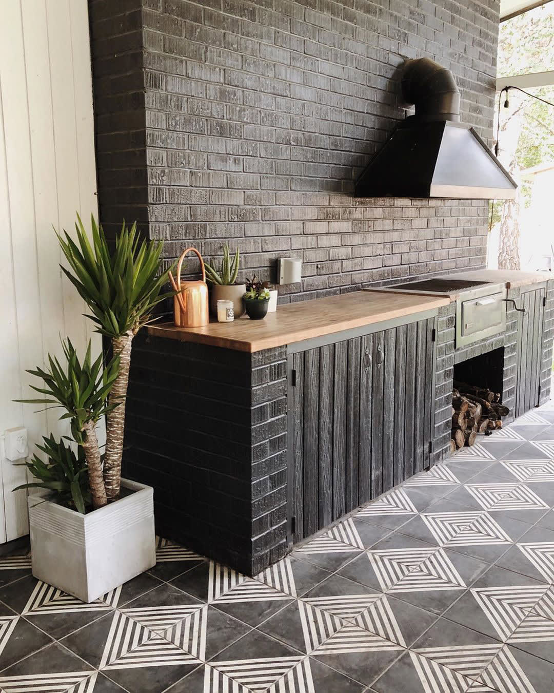The black brick wall of the outdoor kitchen blends so well with Caviar Roads