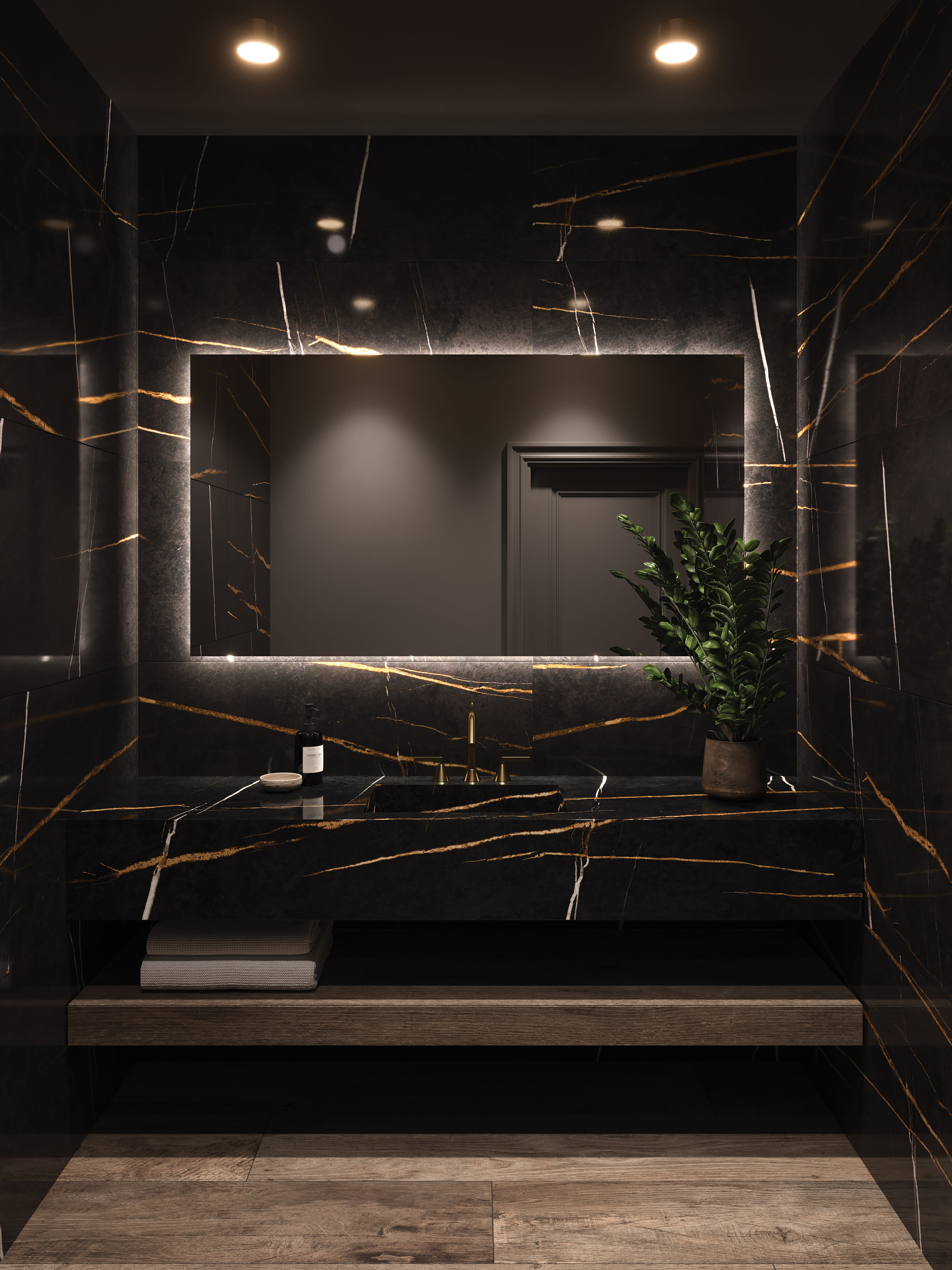 Luxe, ultra-modern, and sleek—this bathroom embraces an edge of its own. With the illuminated mirror, Magnifica radiates as showstopper. Yorkwood featured on the floors balances the dark porcelain throughout the area.
