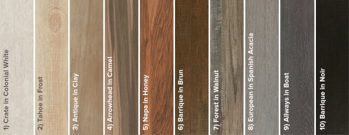 1) Crate in Colonial White 2) Tahoe in Frost 3) Antique in Clay 4) Arrowhead in Camel 5) Napa in Honey 6) Barrique in Brun 7) Forest in Walnut 8) European in Spanish Acacia 9) Always in Boat 10) Barrique in Noir