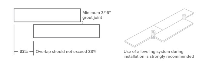 Mininum of 3/16" grout joint size. Since natural wood floors don’t have much of a joint, you don’t want your tile to either. The minimum recommended grout joint for any large format tiles (any one edge is greater than 15”) is 3/16”. All our wood-look tiles are considered large format. Smaller grout joints void any warranties. Without this size joint, the tile won’t be able to adjust to minuscule movements in the subfloor and you’ll end up with breakage, lippage, and an uneven surface.