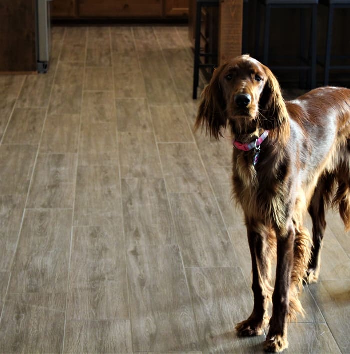 Wood-look porcelain tiles are as close as you can get to scratch proof vs other flooring options. You won’t need to worry about your kids, pets or furniture scratching the floor. Tile doesn’t take on moisture like wood does. This means no warping, cracking, expanding, or staining either. Because it holds up in wet areas, feel free to use it the kitchen, bathroom and shower, laundry room and any other moisture-prone areas in your home.