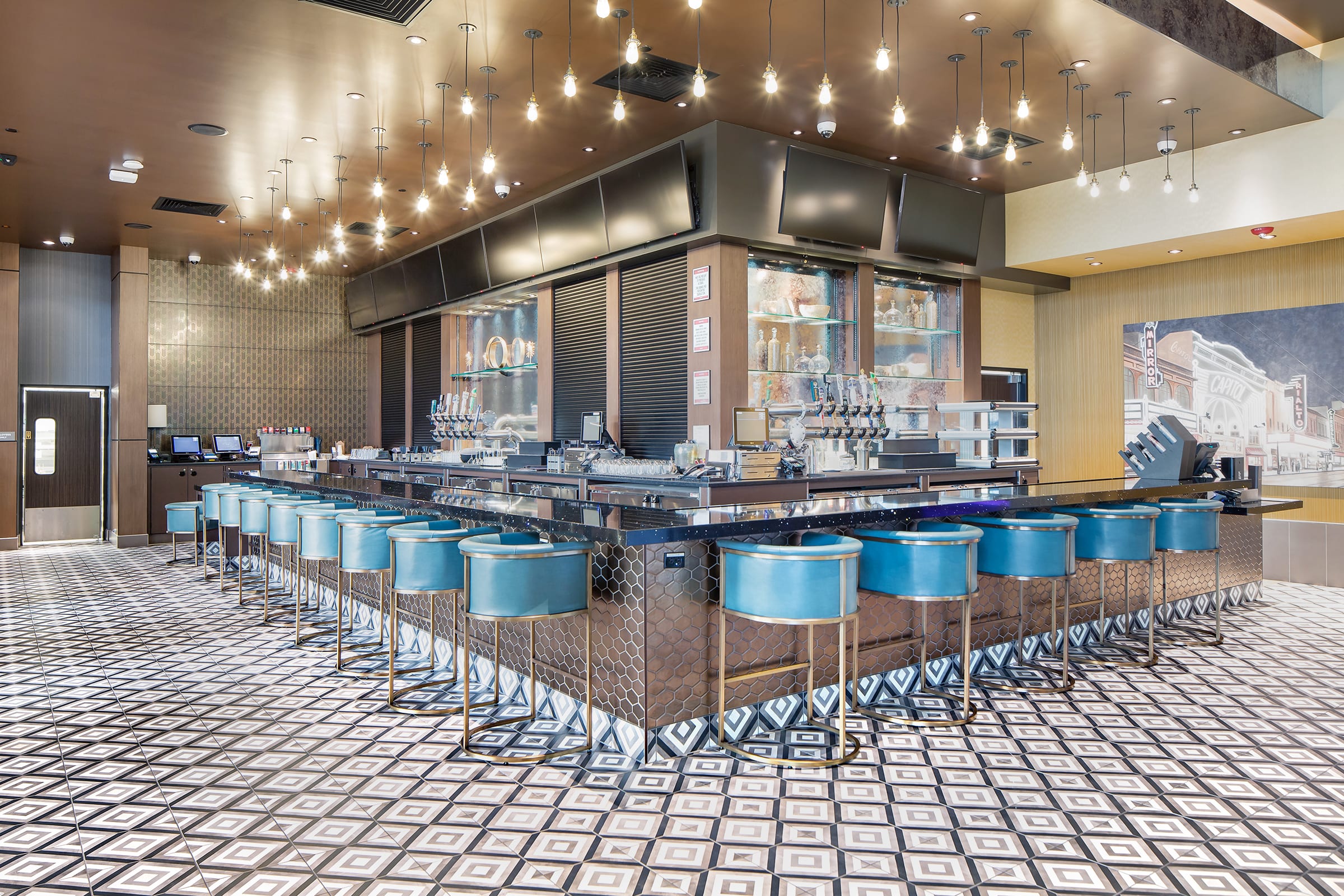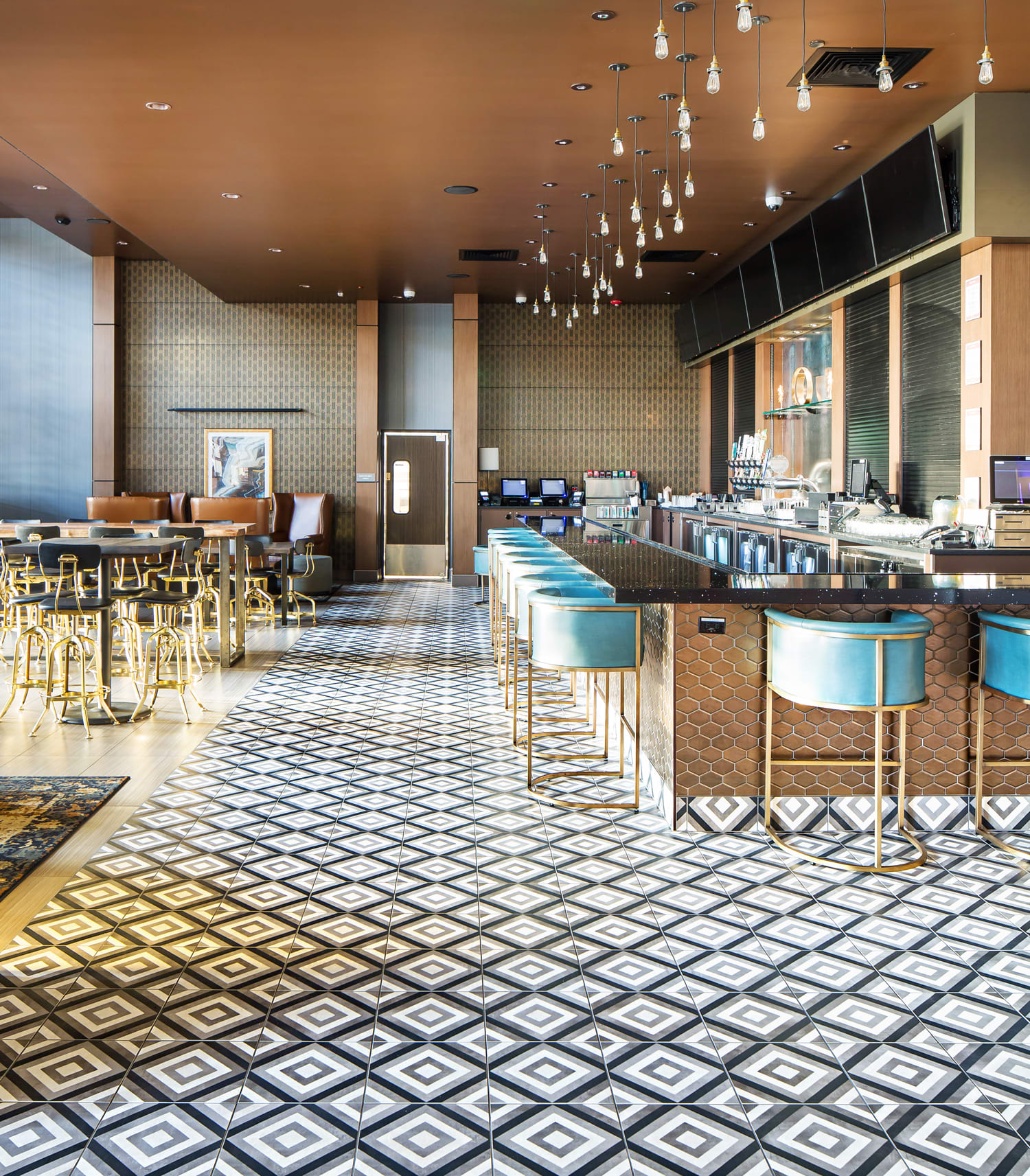 Floor: Chateau 12"x12" porcelain Diamond Deco in Canvas, Smoke and Midnight. Get the look of the bar wall with Hedron 4"x5" Ceramic Flat Wall Tile in Metallic