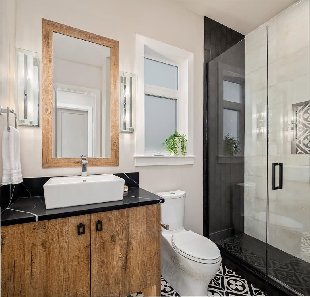Floor: Chateau porcelain 12"x12" Fiore Deco in Canvas/Midnight | Shower accent wall: Chateau 4"x8" ceramic tile in Midnight | Get the look of the countertop with Magnifica Porcelain in Nero Marquina | Source: Enfort Homes
