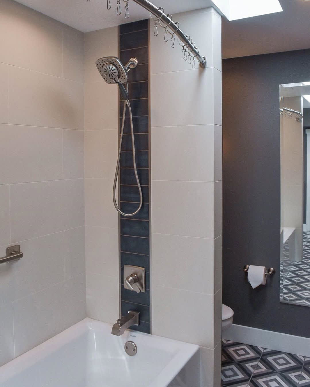 Floor: Chateau porcelain 12"x12" Diamond Deco | Shower fixture wall accent: 4"x8" ceramic wall tile in Ocean | Source: American Dream Design Build