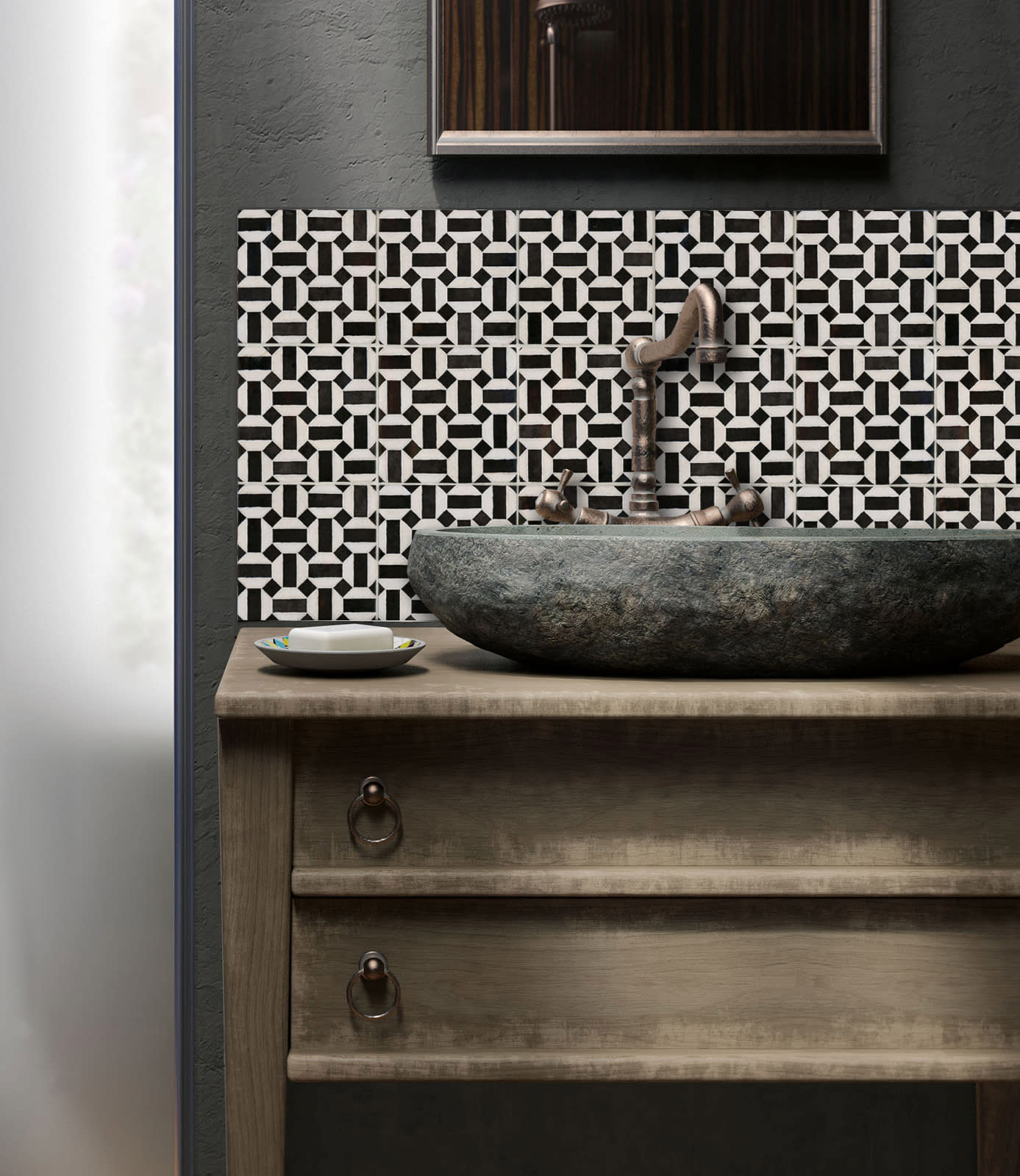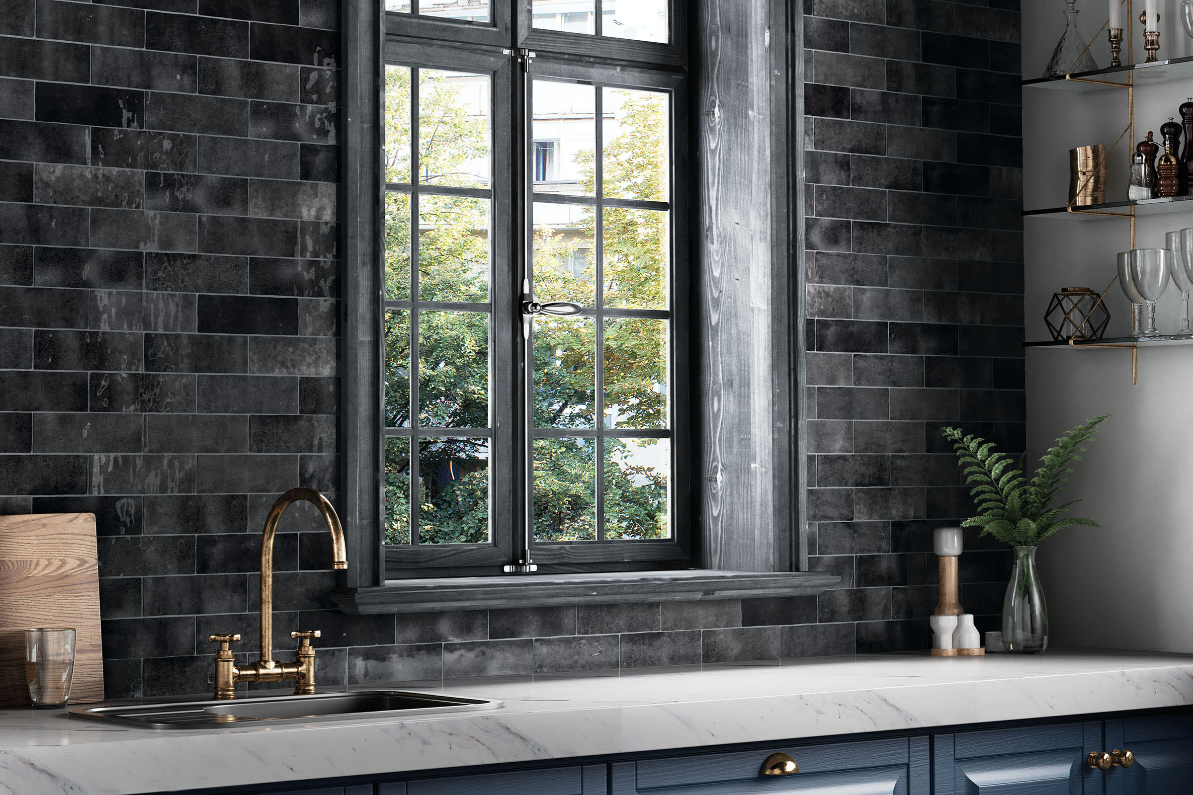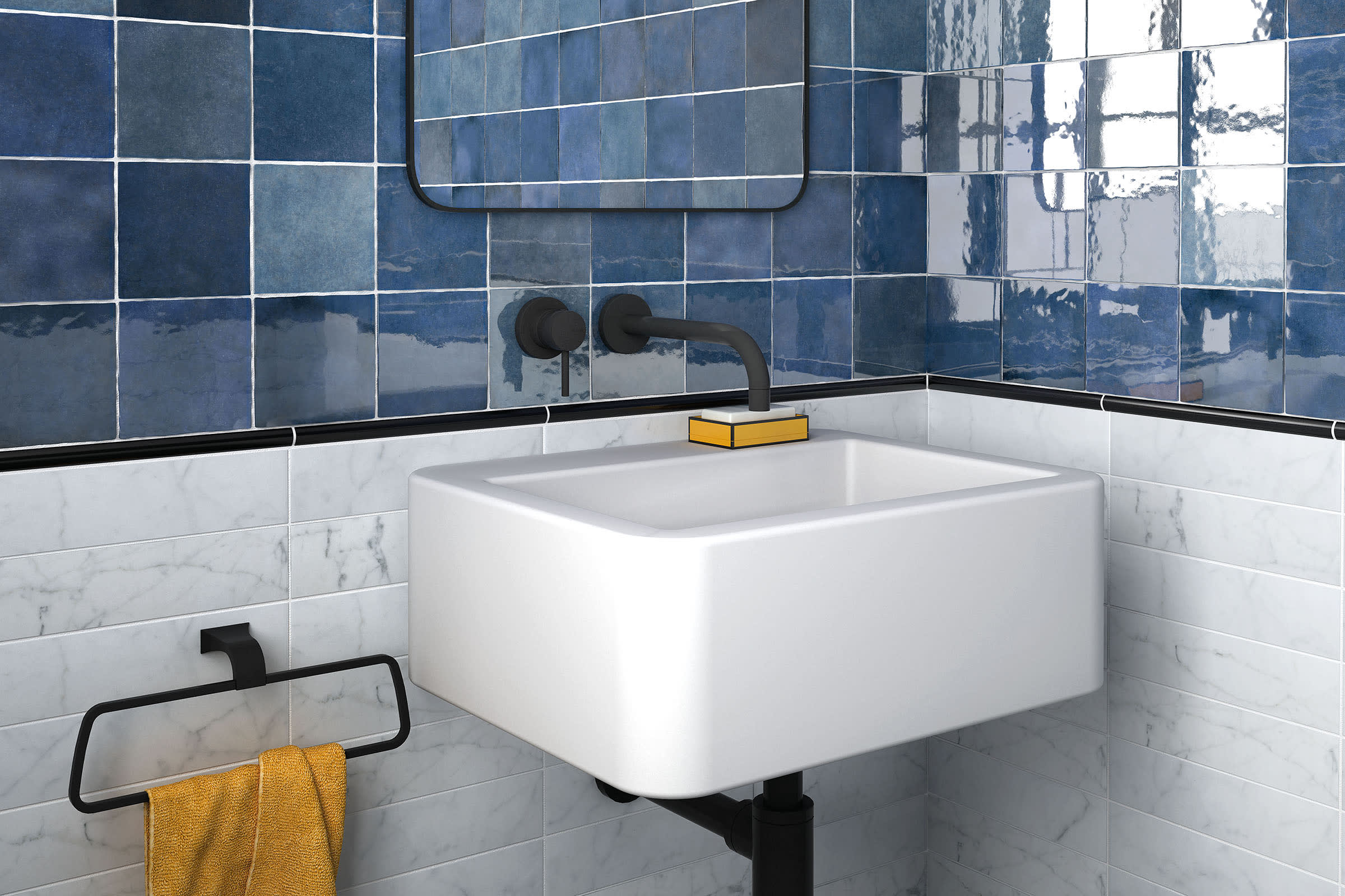 To add versatility, we offer a square 5”x5” black and white patterned deco called Loire that complements all colors in the collection. The graphic pattern of Loire, comprised of hexagons, squares and rectangles, is reminiscent of the Art Deco era and adds a special design element to the collection.