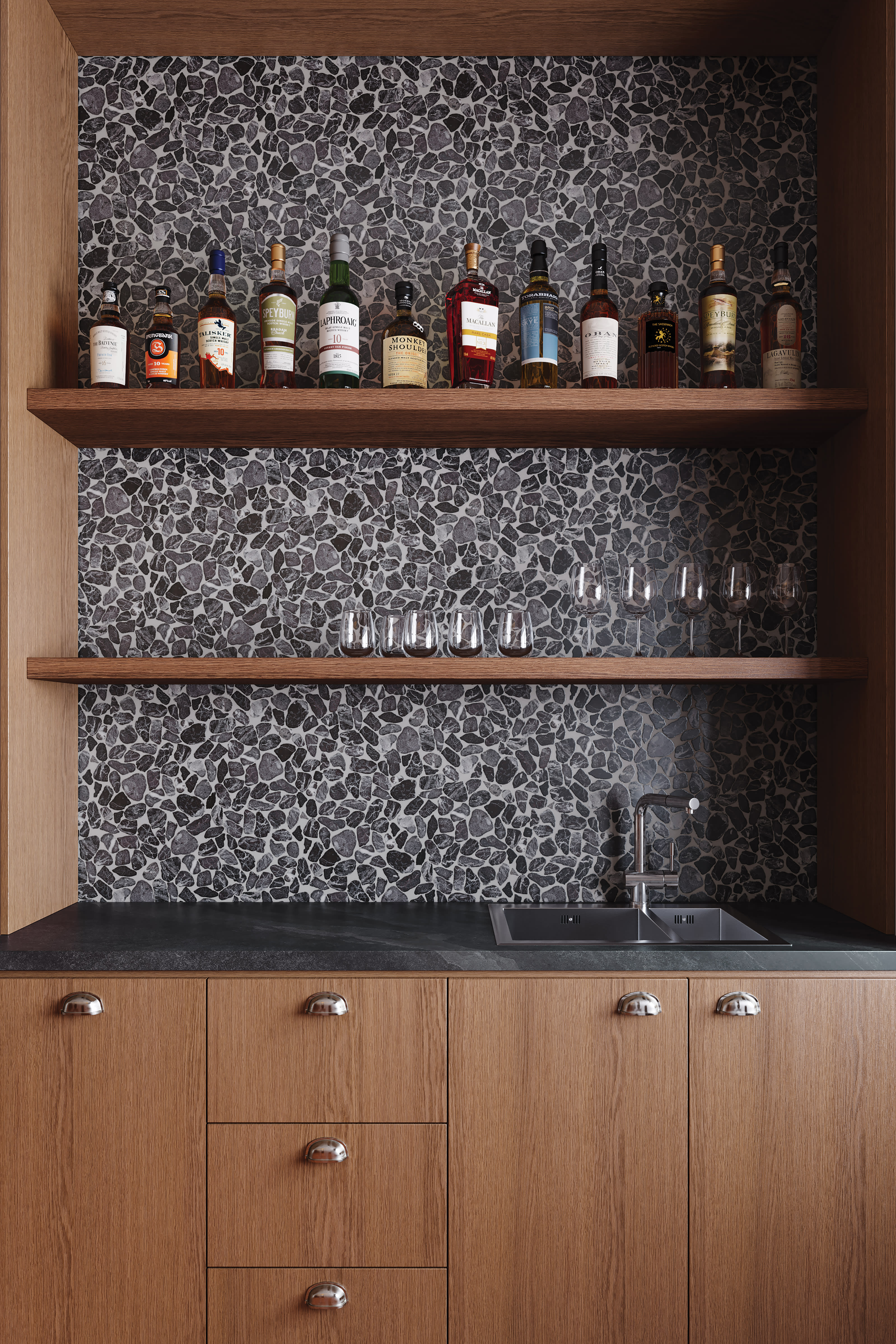 For expansive spaces like countertops, floors, and walls—from kitchens to bathrooms—The Thirties and Nineteen Forty-Eight collections offer an understated yet striking allure. Their broad surfaces radiate a refined opulence that transforms any room on a grand scale.