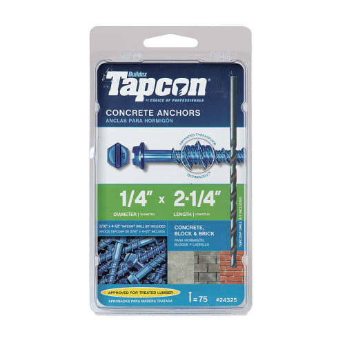 As the original Concrete screw anchor that revolutionized the construction world, Tapcon brand Concrete anchors deliver the ease of use, superior precision and the unparalleled performance that professionals demand. Tapcon Concrete screw anchors draw from its unique ability to TAP its own threads into Concrete, making it an excellent alternative to expansion anchors, plugs and lag shields. Use Tapcon Concrete screw anchors for installing sill plates, electrical equipment, furring strips and many other applications that require fastening into brick, block or Concrete.