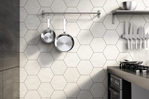 Add geometry to your floors and walls with Allora, an Italian-made matte porcelain tile that comes in three shapes: Rectangle (3”x24”), Rhombus (7.5"x12.75") and Hexagon (8.5”x10”). The neutral colors of White, Gray and Black blend well with any room style. The hexagon shapes also come in three deco options in Fiore (floral pattern), Stella (star pattern) and Telaio (hexagon pattern). Create a solid-colored look, a complete patterned design, or combine the solids and decos for your own look.