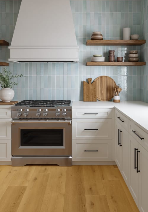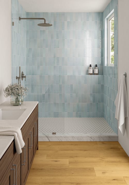 The Cloé Collection is glazed ceramic wall tile characterized by its brilliant colors, smooth gloss finish and interesting variations in hues and tones. Its eight colors: White, Creme, Baby Blue, Grey, Pink, Green, Blue and Black, can be used in a wide range of combinations. Cloé's two sizes, 5x5and 2.5x 8, allow for modern and classic looks. For a pop of pattern, we've included a 5x5 black and white Loire deco. Trim out your projects with the ½x8 Jolly Miter Edge Trim in a gloss finish.