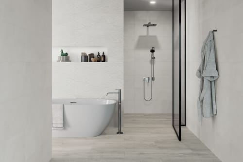 Modern shapes meet soothing hues of glazed ceramic with the Donna Collection. This collection brings simplicity and elegance to your space with matte finished 13in.x40in. field tiles or 13in.x40in. deco tiles. Each wall tile is available in plain or wave deco. Shades offered include white, sand, silver, or beige. The Donna Collection is made in Spain.