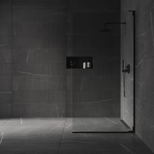 Create a bold and dramatic space with the Nomade collection - a unique selection of glazed porcelain tile with the look of natural stone. Glazed porcelain is smooth, stain-resistant, water-resistant, damage-resistant, and requires little maintenance. It is the perfect selection of tile for indoor and outdoor use. The tiles in this collection are available in 28” x 48” Field Tile and Deco Tile, 3” x 24” Bullnose trim, and 1” x 4” Straight Set Mosaic that comes in 12” x 12” sheets. Each size is offered in neutral Bone, Argent, and Noir shades with a matte finish. The Nomade Collection is made in Spain.