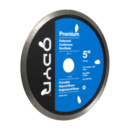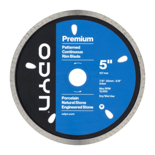 Deliver a flawless cut every time with the ODYN 5 in. Premium Pattern Continuous Rim Blade. This blade is forged using sophisticated diamond blade technology. It is ideal for porcelain, natural stone, and engineered stone. The ODYN 5 in. Premium Pattern Continuous Rim Blade is for dry / wet use with angle grinders and tile saws. It has a Max RPM of 12,000 and ⅞”- 20 mm - ⅝ arbor.