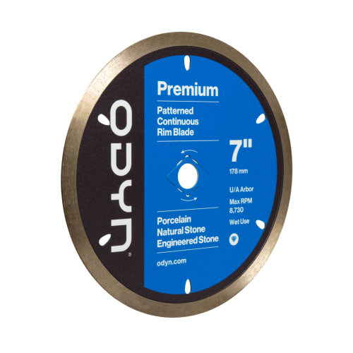 Deliver a flawless cut every time with the ODYN 7 in. Premium Pattern Continuous Rim Blade. This blade is forged using sophisticated diamond blade technology. It is ideal for porcelain, natural stone, and engineered stone. The ODYN 7 in. Premium Pattern Continuous Rim Blade is for wet use with angle grinders and tile saws. It has a Max RPM of 8,730 and U/A arbor.