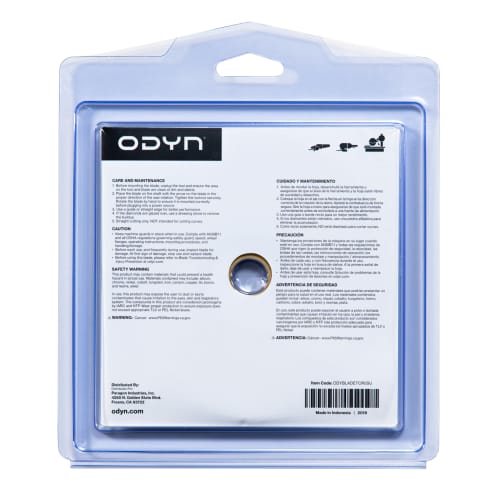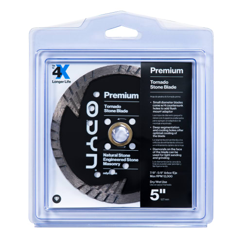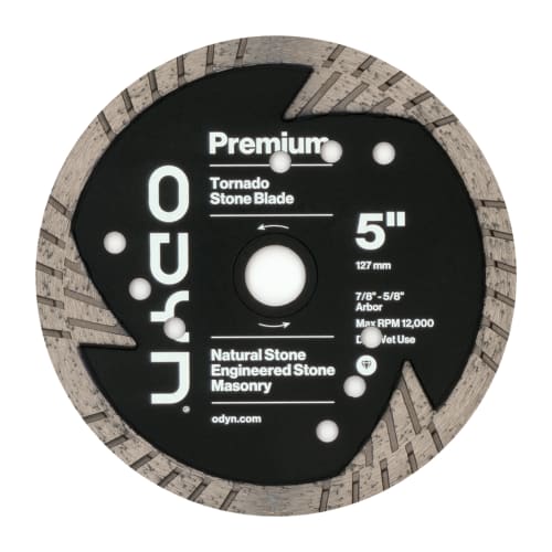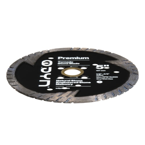 For a superior cut, use the ODYN 5 in. Premium Tornado Stone Blade. This blade is designed to cut through natural stone, engineered stone, and other masonry applications easily. It features small diameter blades with countersunk holes to add a flush mount adaptor as well as deep segmentation and holes for optimal cooling. It also has diamonds on the face of the blade to be used for light sanding and grinding. The ODYN 5 in. Premium Tornado Stone Blade is for dry / wet use with angle grinders and tile saws. It has a Max RPM of 12,000 and ⅞”-⅝” arbor.